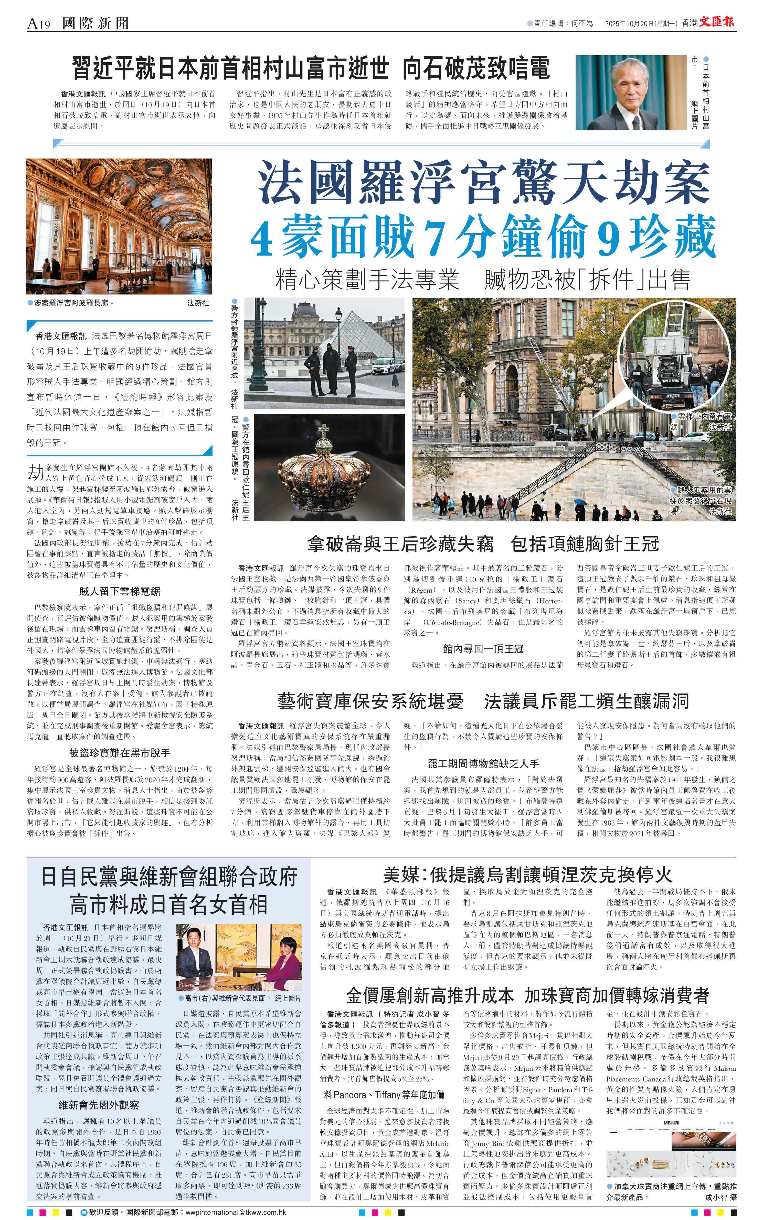 香港文匯報訊 法國巴黎著名博物館羅浮宮周日(10月19日)上午遭多名劫匪搶劫,竊賊搶走拿破崙及其王后珠寶收藏中的9件珍品,法國官員形容賊人手法專業,明顯經過精心策劃,館方則宣布暫時休館一日。《紐約時報》形容此案為「近代法國最大文化遺產竊案之一」。法媒指暫時已找回兩件珠寶,包括一頂在館內尋回但已損毀的王冠。
