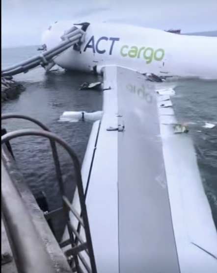 消防及警方仍在現場戒備。據了解,是一架巡邏車被貨機撞到後墮海,車上兩人死亡。從網上圖片所見整架貨機衝落海,機身半浸在海面,逃生滑梯亦彈出,機尾開兩截。巡邏車墮海,消防出動搜救,並出動17部救護車戒備。消息指,消防在海中的車救起兩名男子,其中一名30歲男子證實死亡;另一名40多歲男子送到北大嶼山醫院搶救後不治。警方相信兩名死者是巡邏車司機及乘客。