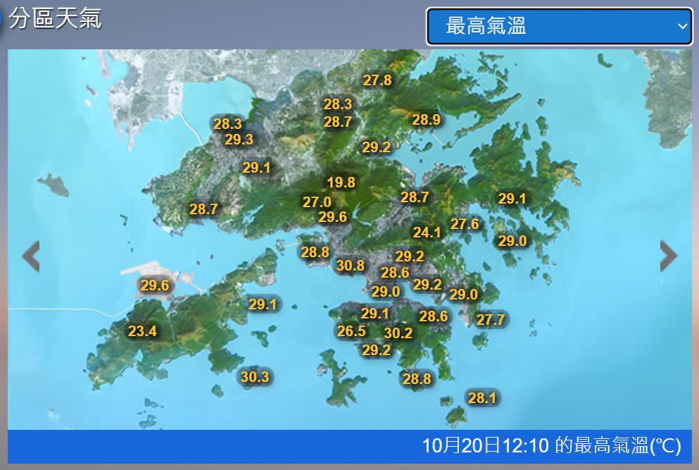 本港地區下午及今晚天氣預測,大致多雲。下午部分時間天色明朗。稍後有幾陣雨,晚上市區氣溫顯著下降至最低約23度,新界再低一兩度。吹和緩至清勁偏北風,離岸吹強風,稍後高地間中達烈風程度。海有大浪及湧浪。