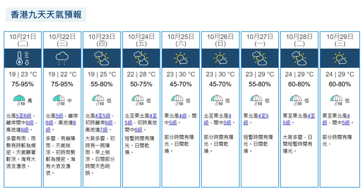 展望明日及星期三初時雨勢較為頻密。未來兩三日風勢持續頗大,市區氣溫顯著下降至19度左右,新界再低兩三度。海有大浪及湧浪。晚上部分沿岸低窪地區可能出現水浸。