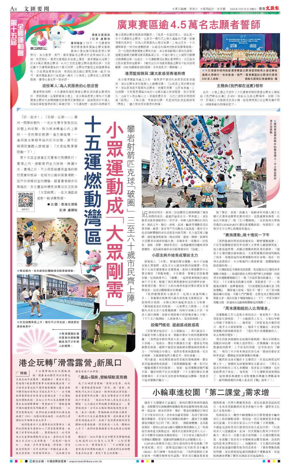 第十五屆全運會正式賽事已陸續舉行。賽場之內,運動員們全力拚搏、揮灑汗水;賽場之外,不少民眾被體育盛事的熱烈氛圍所感染,從城市公園到專業場館,從戶外休閒到室內體驗,隨着賽事腳步日漸臨近,多元豐富的體育消費項目正成為 「大眾剛需」,在大灣區掀起新一輪消費熱潮。