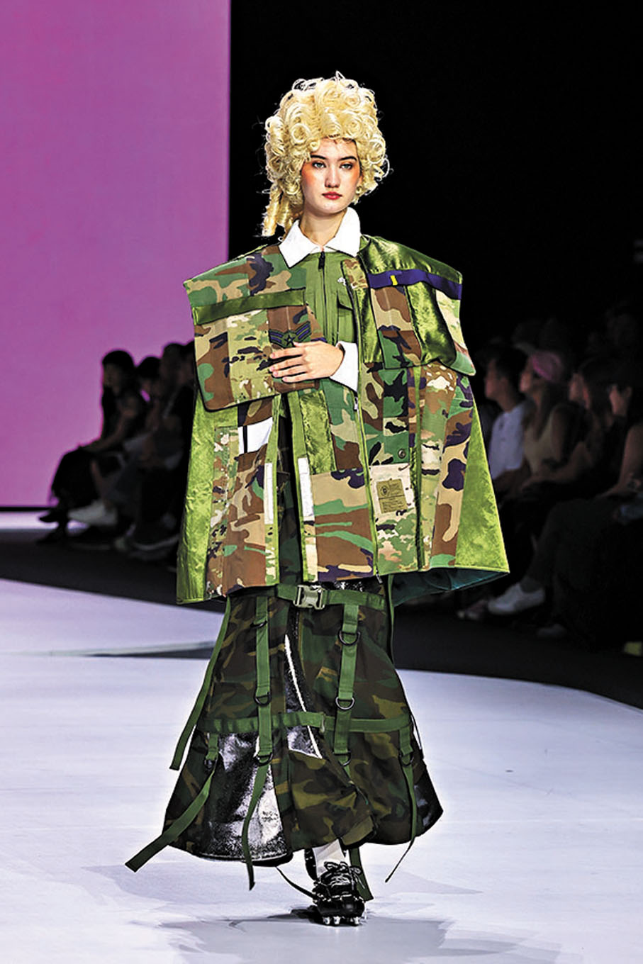 今年在CENTRESTAGE展會上,selfFab. 帶來的新系列延續「文化混種」的概念,以古着迷彩、波衫與中世紀元素交錯,構築出「再生戰袍」式的造型,既張揚又富含深度。系列中,足球文化中的「秘密球衣」、軍服的迷彩元素,以及19世紀維多利亞時期的宮廷華麗風格相互碰撞,看似衝突的元素背後,蘊藏着細膩的設計巧思:迷彩象徵隱藏與封閉,波衫代表身份的張揚,二者結合正是對「打破身份標籤」的詮釋。