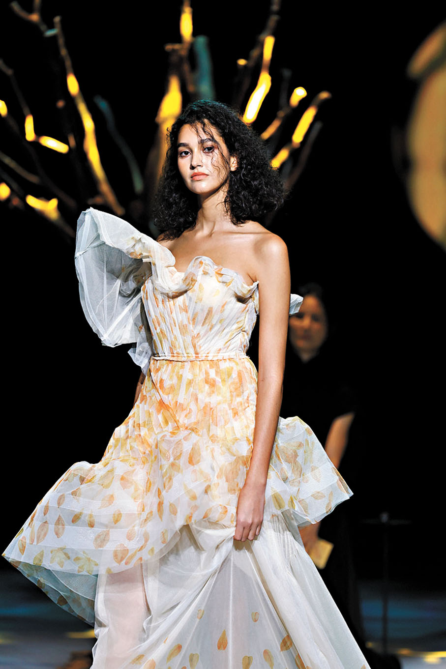 設計師Mountain Yam(任朗呈)特別將時裝秀分為兩幕。第一幕作為品牌十周年的核心獻禮,他深入挖掘1930年代香港的歷史影像,從中西交融的建築與服飾中汲取舊時代美學養分。系列作品以現代時裝手法重新演繹經典旗袍廓形,並透過環保創新面料與前衛剪裁相互結合,展現華服的現代時尚韻味。