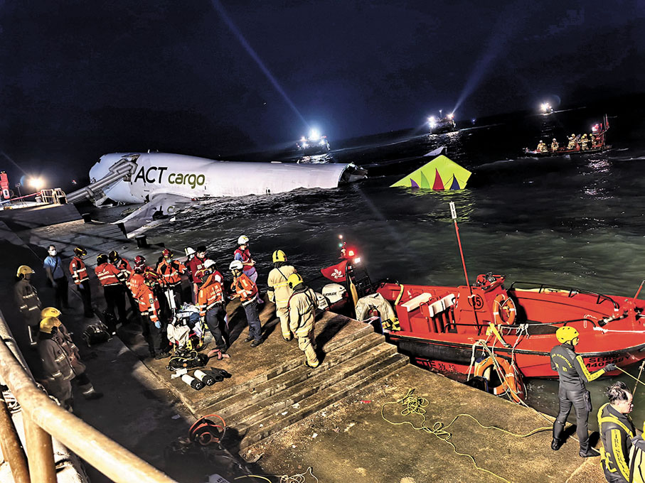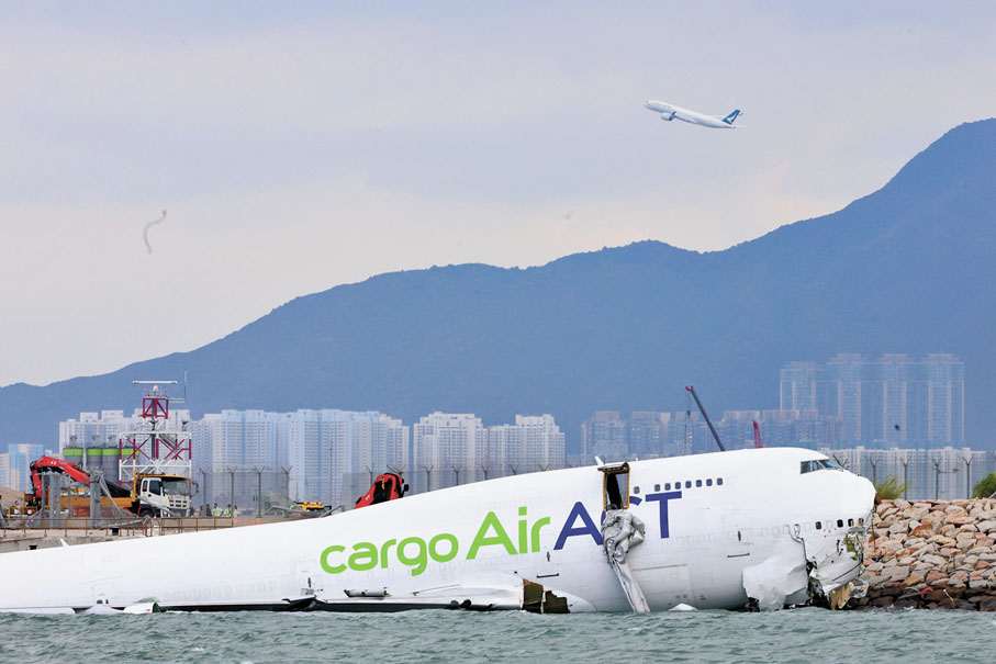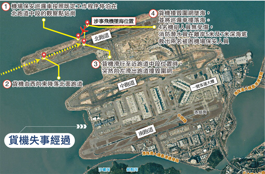 香港國際機場昨日凌晨發生嚴重的飛機事故。一架阿聯酋航空的波音747貨機飛抵香港國際機場北跑道降落後滑行至中段時,突然急轉向偏離跑道衝破圍網墜海,連帶停在跑道外圍候命的機場保安公司巡邏車也一併墜海,貨機即時斷為兩截,機長等4名機組人員無恙,但巡邏車司機和乘客兩人不幸身亡。機管局啟動機場應變中心,包括機場消防人員在內的相關部門迅速救援和應變,逾千航班改用南跑和中跑升降,全日航班運作未受影響。民航意外調查機構已就事故展開調查,包括循飛機系統、維修、操作、天氣及跑道狀況等多方面調查肇因。 ●香港文匯報記者 蕭景源