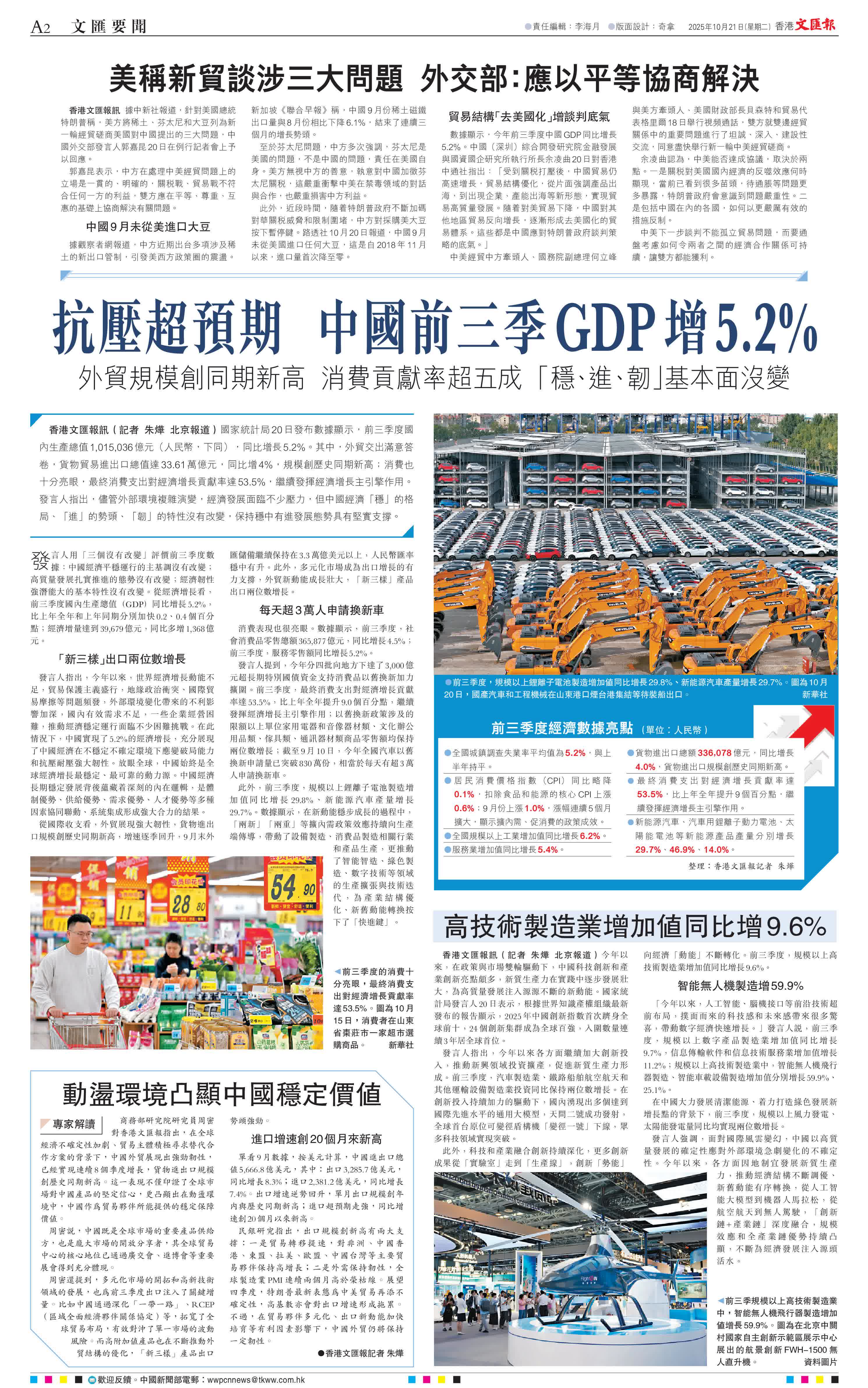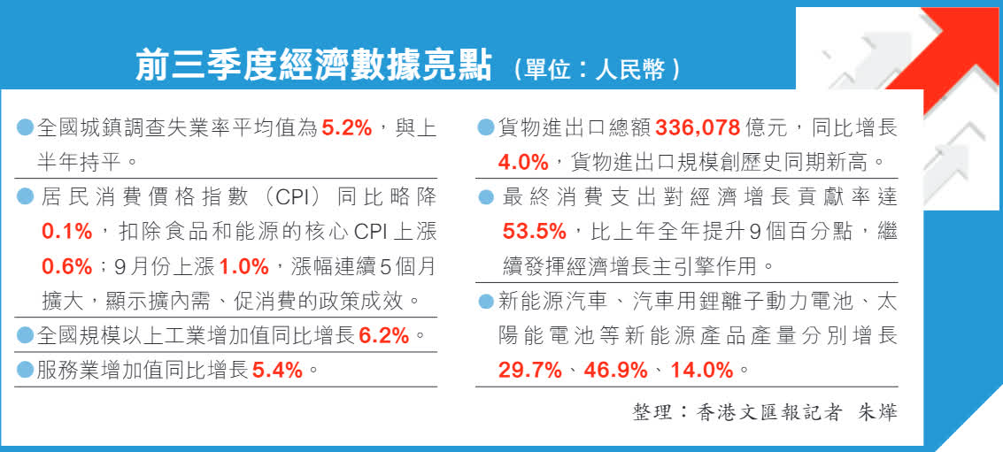 (香港文匯報記者朱燁 北京報道)國家統計局20日發布數據顯示,前三季度國內生產總值1,015,036億元(人民幣,下同),同比增長5.2%。其中,外貿交出滿意答卷,貨物貿易進出口總值達33.61萬億元,同比增4%,規模創歷史同期新高;消費也十分亮眼,最終消費支出對經濟增長貢獻率達53.5%,繼續發揮經濟增長主引擎作用。發言人指出,儘管外部環境複雜演變,經濟發展面臨不少壓力,但中國經濟「穩」的格局、「進」的勢頭、「韌」的特性沒有改變,保持穩中有進發展態勢具有堅實支撐。