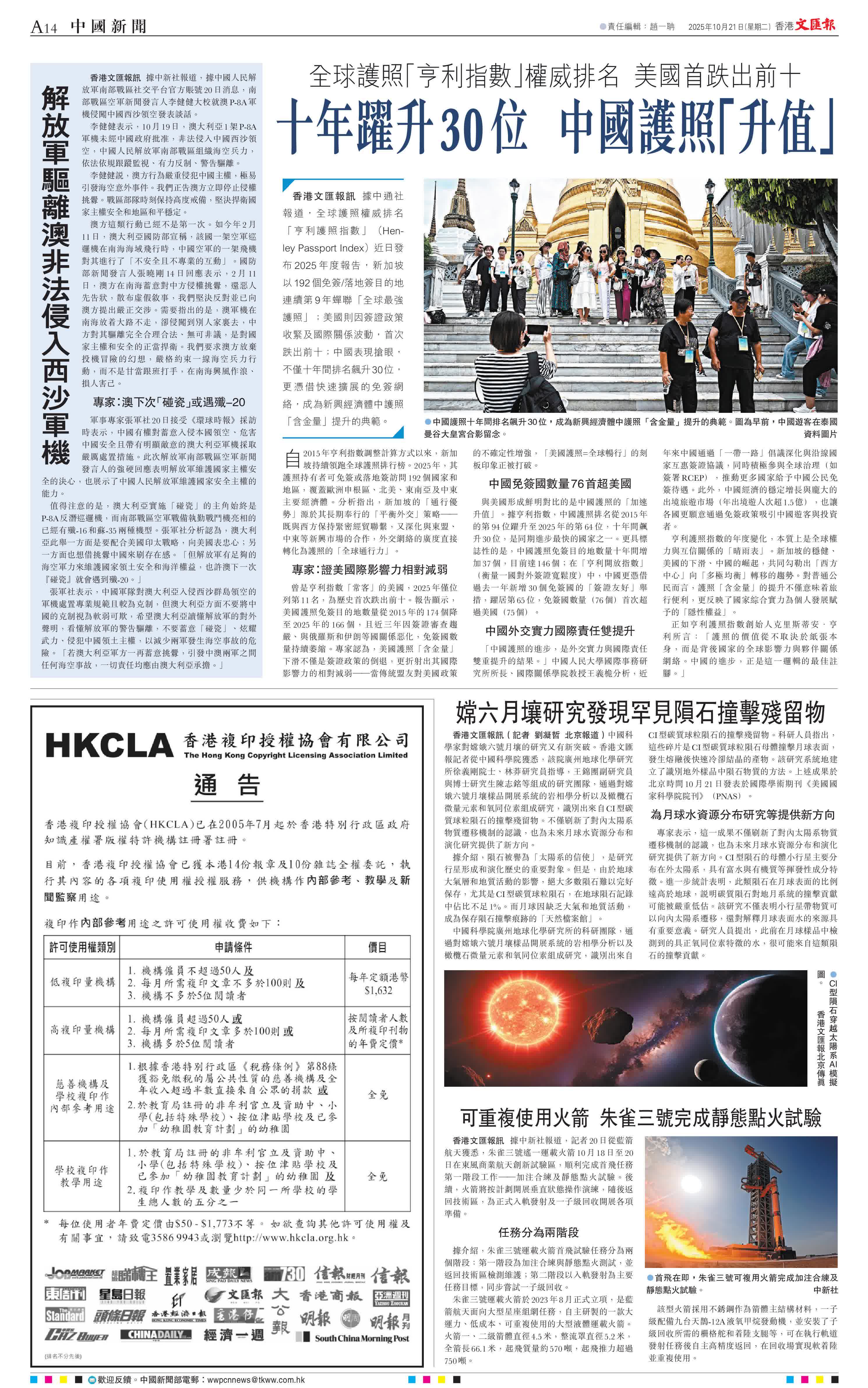 香港文匯報訊 據中通社報道,全球護照權威排名「亨利護照指數」(Henley Passport Index)近日發布2025年度報告,新加坡以192個免簽/落地簽目的地連續第9年蟬聯「全球最強護照」;美國則因簽證政策收緊及國際關係波動,首次跌出前十;中國表現搶眼,不僅十年間排名飆升30位,更憑借快速擴展的免簽網絡,成為新興經濟體中護照「含金量」提升的典範。