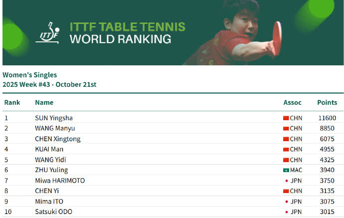 香港文匯網訊 10月21日,國際乒聯公布2025年第43周排名:女單方面,孫穎莎11600分連續第171周霸榜第一,王曼昱8850分排名第二,陳幸同6075分排名第三。