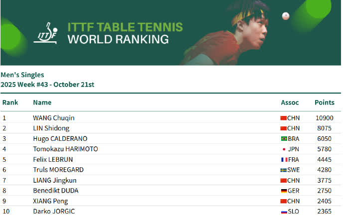 男單方面,王楚欽10900分排名第一,林詩棟8075分排名第二,雨果6050分排名第三。