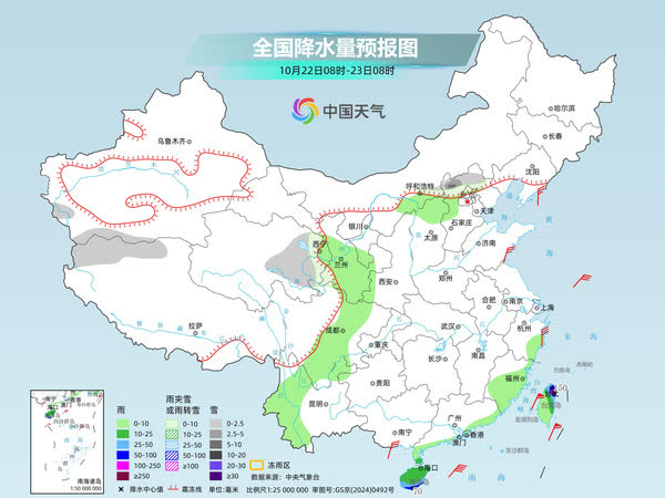 明天,西藏西北部、青海東部、華北北部等地部分地區有小雪或雨夾雪,其中,河北北部等地部分地區有中到大雪。海南島、台灣島等地部分地區有中到大雨,其中,海南島南部、台灣島北部等地部分地區有暴雨或大暴雨。