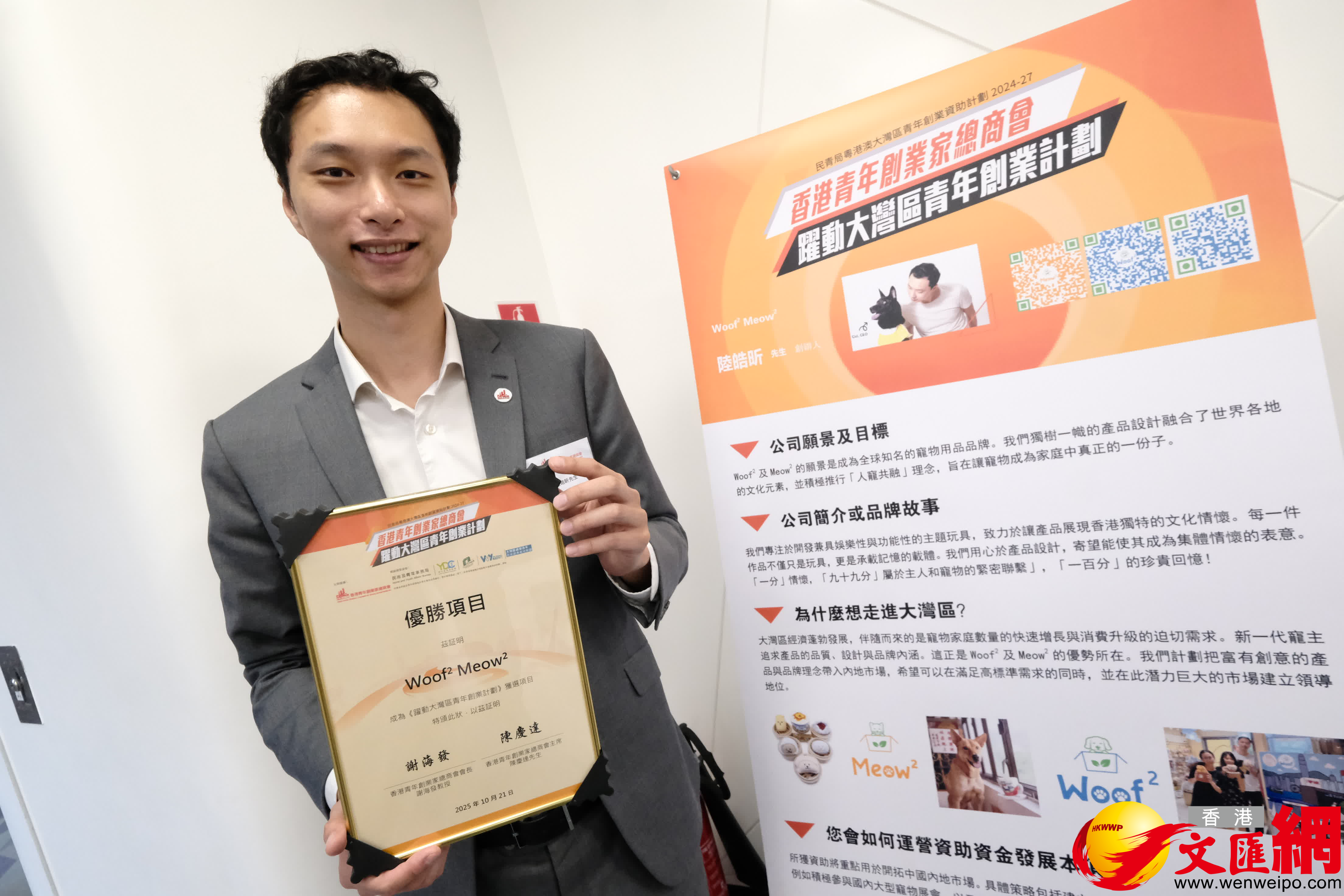 此外,日益蓬勃的寵物經濟更已形成一個年規模逾40億港元的消費市場。得獎項目Woof²及Meow²創辦人陸皓昕表示,公司專注開發兼具娛樂性與功能性的主題玩具,致力於讓產品展現香港獨特的文化情懷,當中包括雞蛋仔等街頭小食,以及剛剛推出、全港第一個點心造型的寵物玩具盲盒。被問到施政報告2025推動寵物友善政策,他直言「非常贊成」,許多香港人因飼養寵物而難以北上消費,若能允許寵物進入餐廳,將有助帶動相關經濟活動,「全球都在推行這類措施,香港也需加快步伐。」他亦透露,隨着政策推動,越來越多餐廳及蛋糕店向其公司尋求合作,例如銷售寵物玩具,進一步拓展市場。
