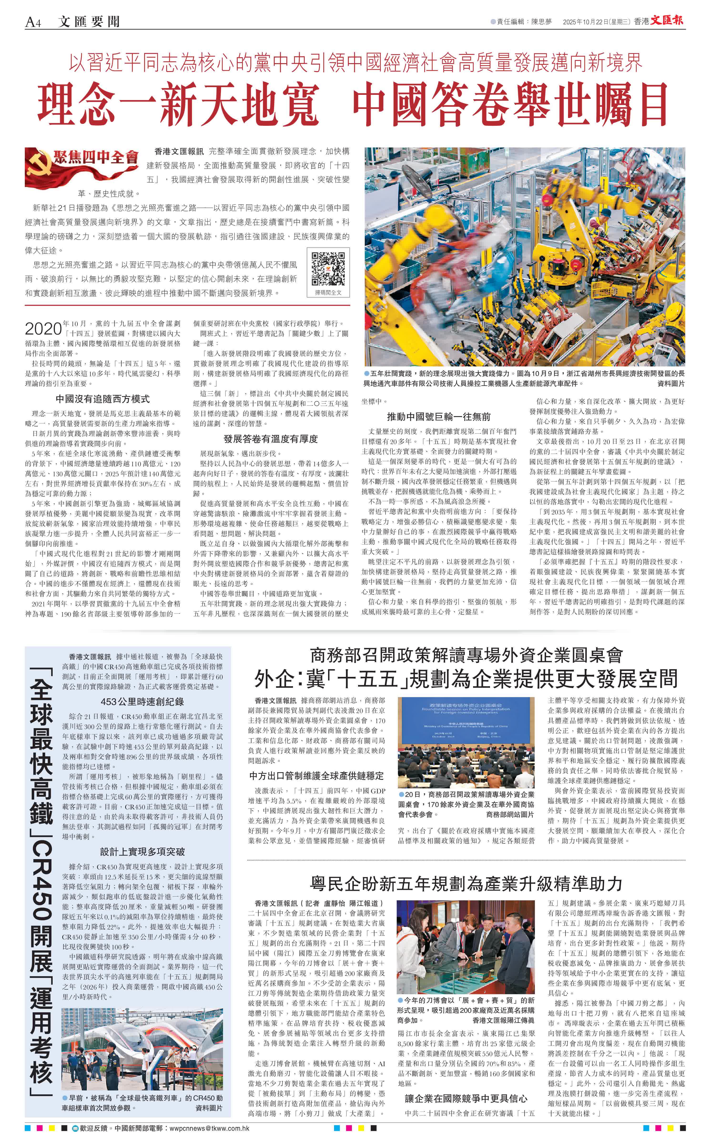 文章最後指出,10月20日至23日,在北京召開的黨的二十屆四中全會,審議《中共中央關於制定國民經濟和社會發展第十五個五年規劃的建議》,為新征程上的關鍵五年擘畫藍圖。