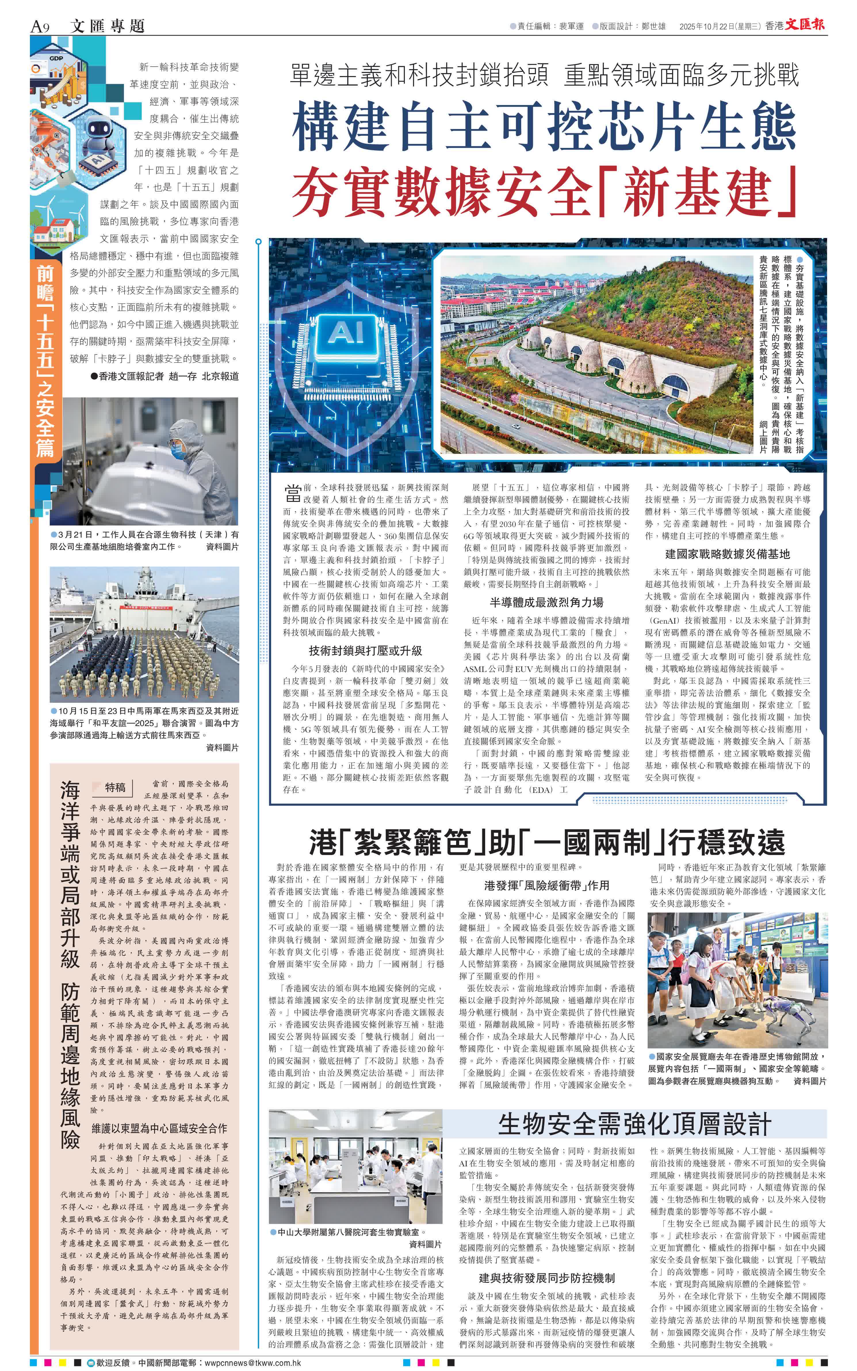 (香港文匯報記者 趙一存 北京報道)新一輪科技革命技術變革速度空前,並與政治、經濟、軍事等領域深度耦合,催生出傳統安全與非傳統安全交織疊加的複雜挑戰。今年是「十四五」規劃收官之年,也是「十五五」規劃謀劃之年。談及中國國際國內面臨的風險挑戰,多位專家向香港文匯報表示,當前中國國家安全格局總體穩定、穩中有進,但也面臨複雜多變的外部安全壓力和重點領域的多元風險。其中,科技安全作為國家安全體系的核心支點,正面臨前所未有的複雜挑戰。他們認為,如今中國正進入機遇與挑戰並存的關鍵時期,亟需築牢科技安全屏障,破解「卡脖子」與數據安全的雙重挑戰。