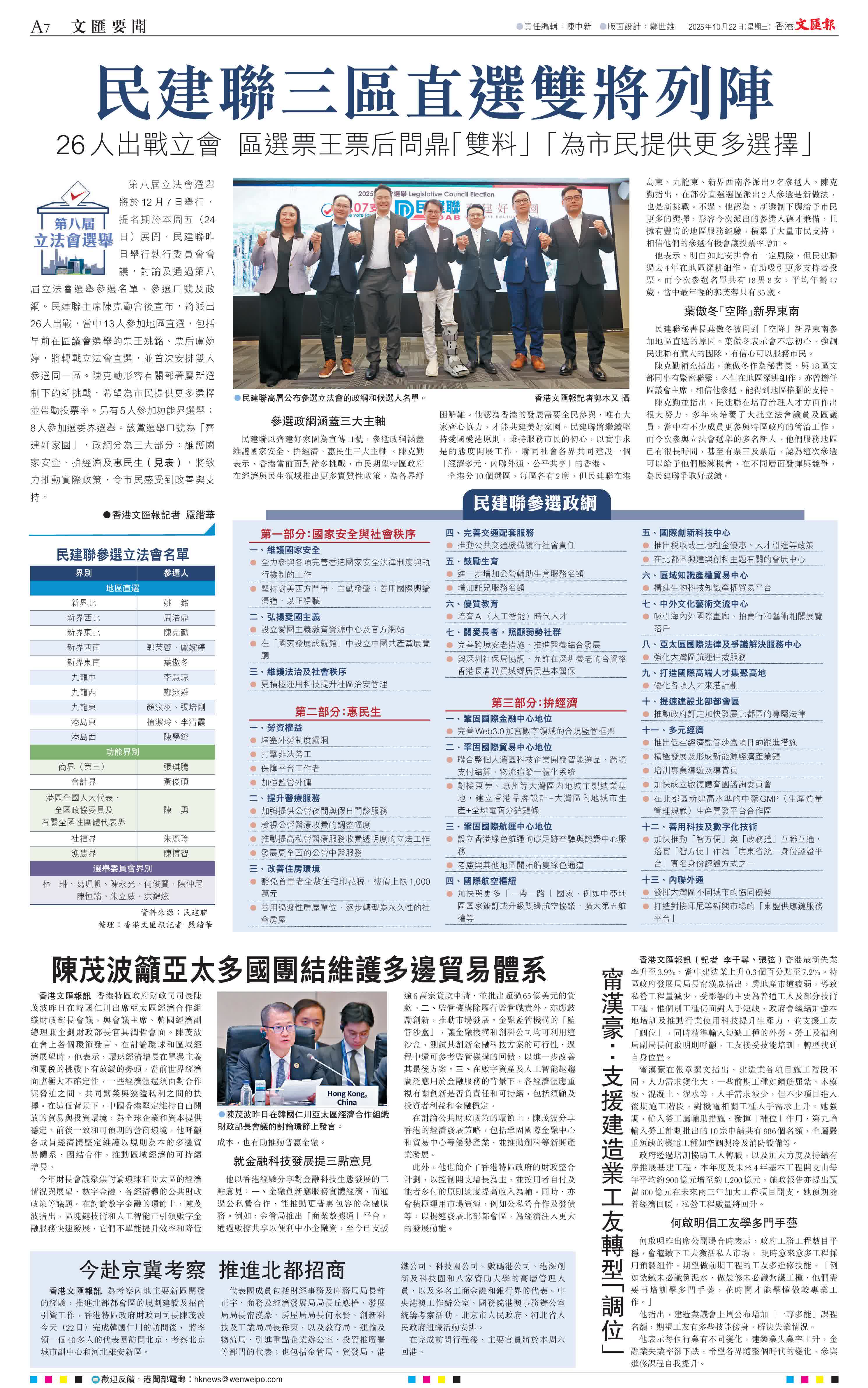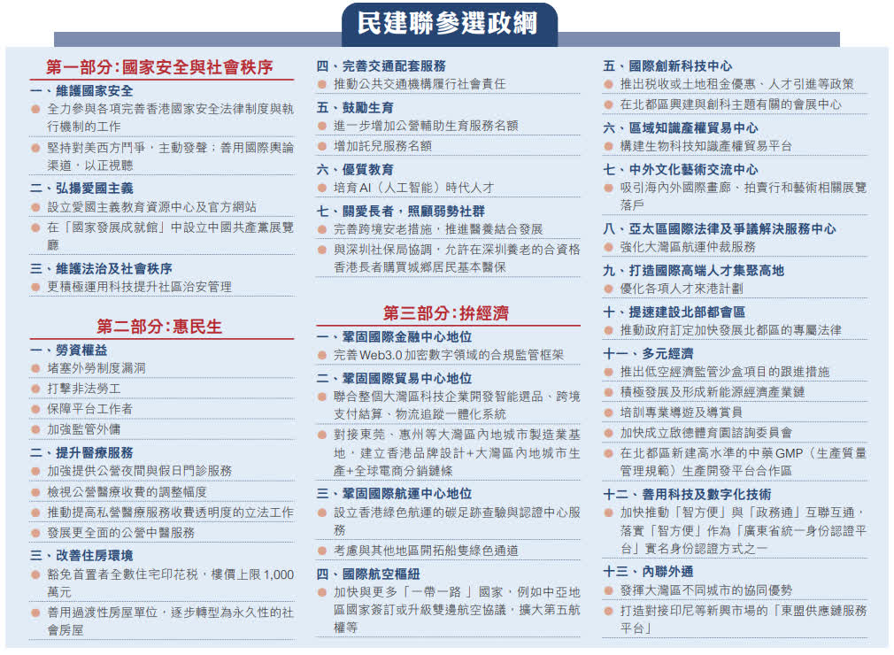 (香港文匯報記者 嚴鍇華)第八屆立法會選舉將於12月7日舉行,提名期於本周五(24日)展開,民建聯昨日舉行執行委員會會議,討論及通過第八屆立法會選舉參選名單、參選口號及政綱。民建聯主席陳克勤會後宣布,將派出26人出戰,當中13人參加地區直選,包括早前在區議會選舉的票王姚銘、票后盧婉婷,將轉戰立法會直選,並首次安排雙人參選同一區。陳克勤形容有關部署屬新選制下的新挑戰,希望為市民提供更多選擇並帶動投票率。另有5人參加功能界選舉;8人參加選委界選舉。該黨選舉口號為「齊建好家園」,政綱分為三大部分:維護國家安全、拚經濟及惠民生(見表),將致力推動實際政策,令市民感受到改善與支持。