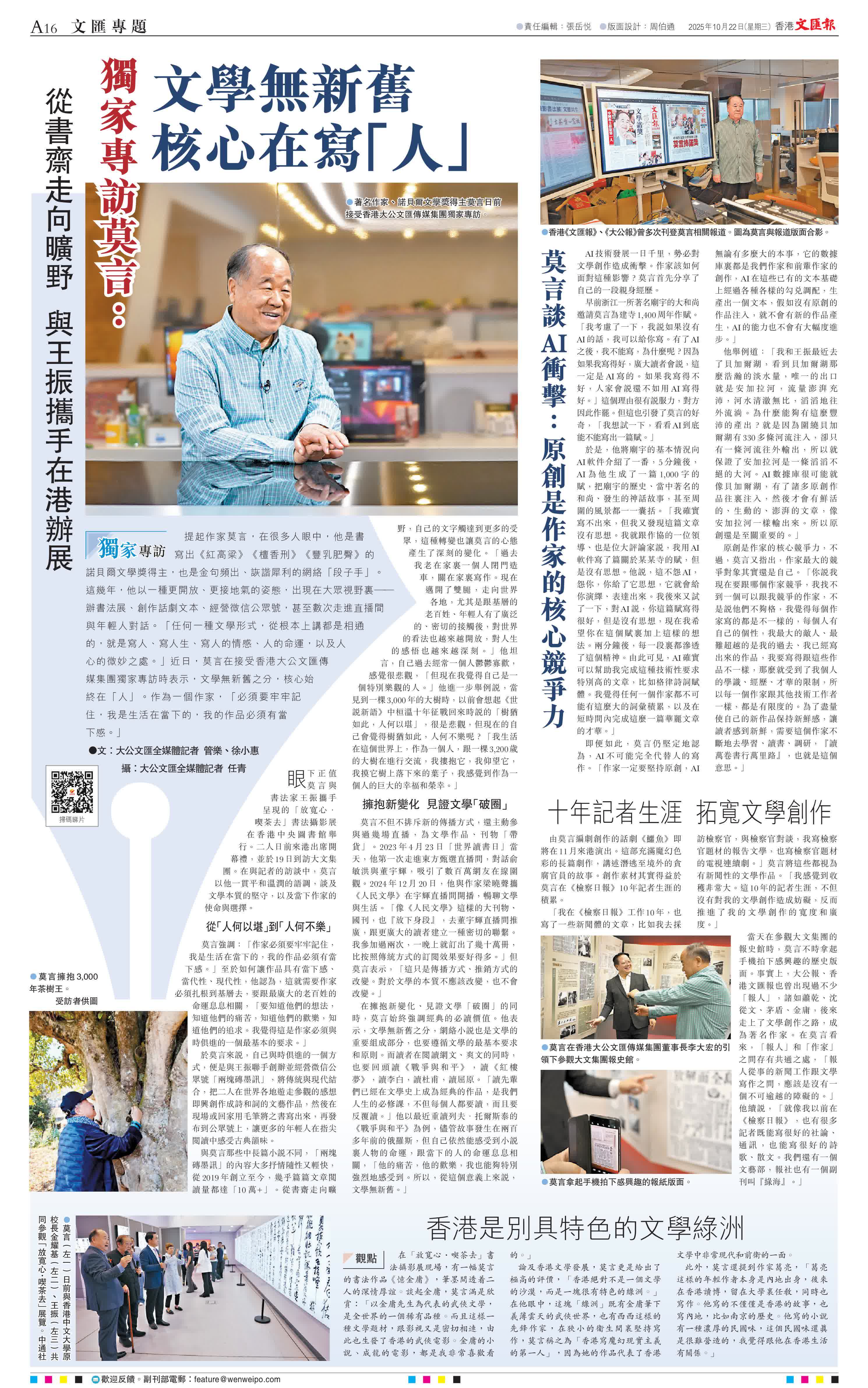 眼下正值莫言與書法家王振攜手呈現的「放寬心·喫茶去」書法攝影展在香港中央圖書館舉行。二人日前來港出席開幕禮,並於19日到訪大文集團。在與記者的訪談中,莫言以他一貫平和溫潤的語調,談及文學本質的堅守,以及當下作家的使命與選擇。