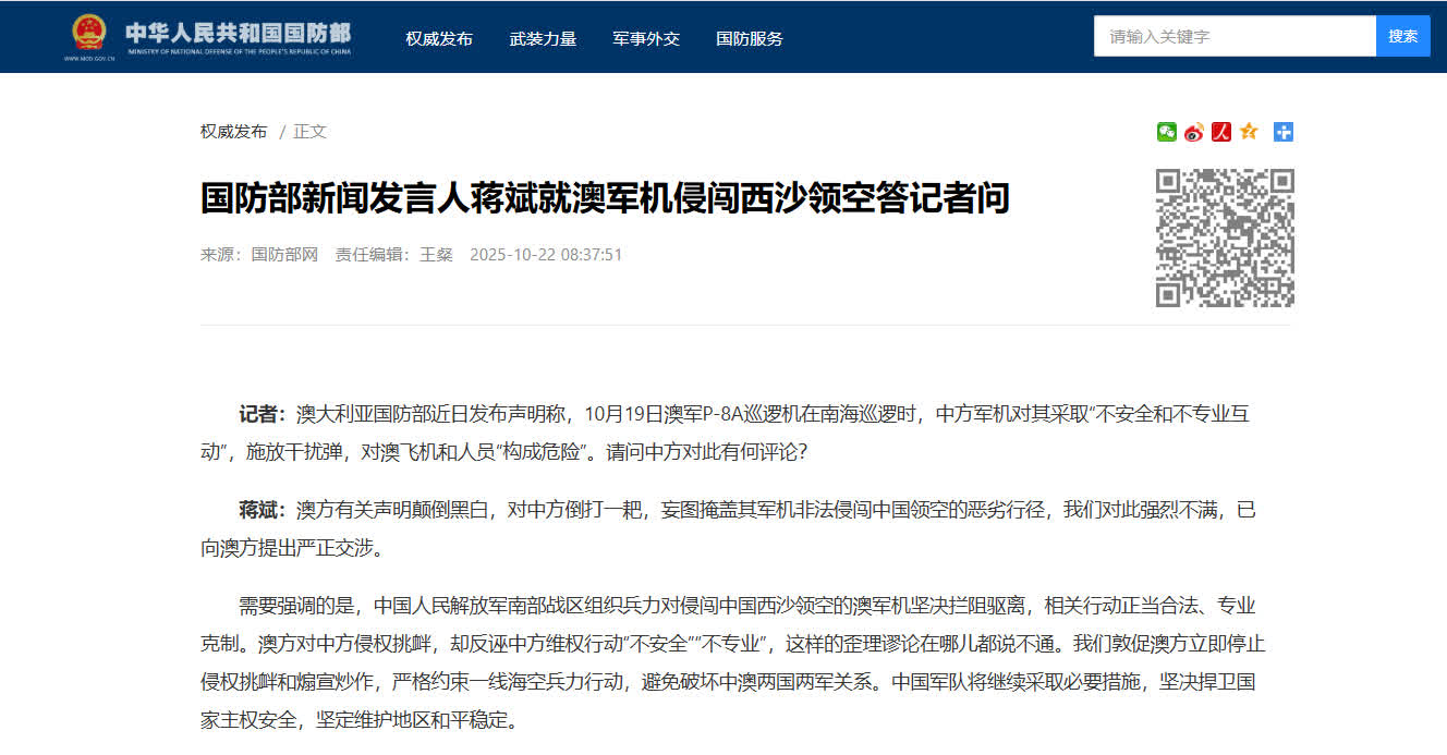 據國防部網站消息,今日,國防部新聞發言人蔣斌就澳軍機侵闖西沙領空答記者問。