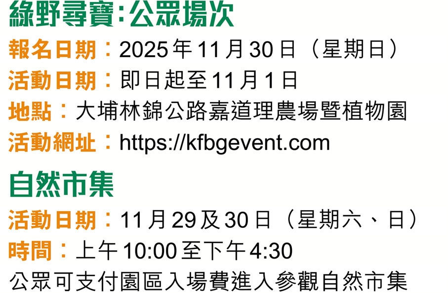 活動分為11月29日的學校專場及30日的公眾場次,公眾人士可組成二人或四人隊伍參與尋寶之旅,於園區的上、下山區內展開探索香港生態系統的任務。活動日園區亦有多項導賞及體驗活動,包括人氣極高的「動物全接觸」;讓參與者親身了解前線救援與復育工作的「野生動物拯救中心導賞團」等。各項活動名額有限,報名從速!