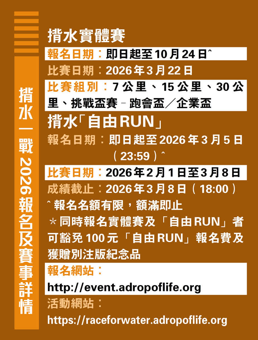由「點滴是生命」主辦的慈善越野賽「揹水一戰2026」將於明年3月22日在港島徑開跑,讓大眾透過揹水負重越野親歷缺水居民的日常艱辛。賽事今年更新增7公里短途賽程及虛擬賽揹水「自由RUN」,令新手與專業跑手都能感受揹水挑戰山野的魅力!