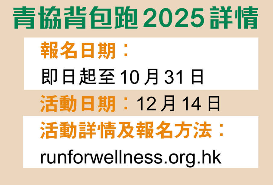 由香港青年協會主辦的「青協背包跑2025」將於12月14日假將軍澳將藍公路花園舉行,活動以「踏出第一步,展現你態度」為主題,鼓勵青年勇於嘗試,勇敢迎接挑戰,同時為青協的全健服務籌款,推動青少年身心健康發展。賽事日除會決出三個距離組別王者,同場亦有嘉年華讓公眾減壓解憂。