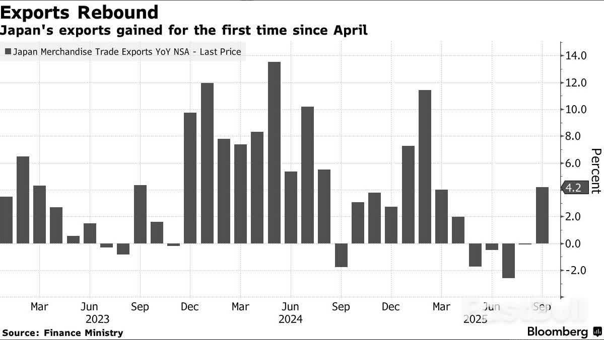 據日本當局周三(10月22日)公布的數據,9月份日本的出口額增長了4.2%,略低於經濟學家預測的4.4%,不過是5個月以來首次增長,這是由於日本對亞洲的強勁出口抵消了對美國的出口下降。