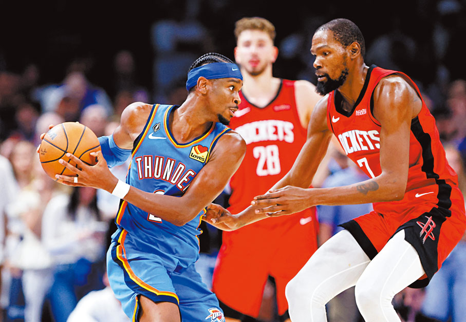 香港文匯報訊(記者 郭正謙)上屆總冠軍雷霆與爭標熱門之一的火箭,以一場精彩大戰為新一季NBA拉開序幕。雷霆憑藉頭號球星亞歷山大尾段發威,經過雙加時後以125:124反敗為勝,新加盟火箭的杜蘭特雖然有23分進賬,不過關鍵時刻卻連續射失罰球,成為輸波罪人。