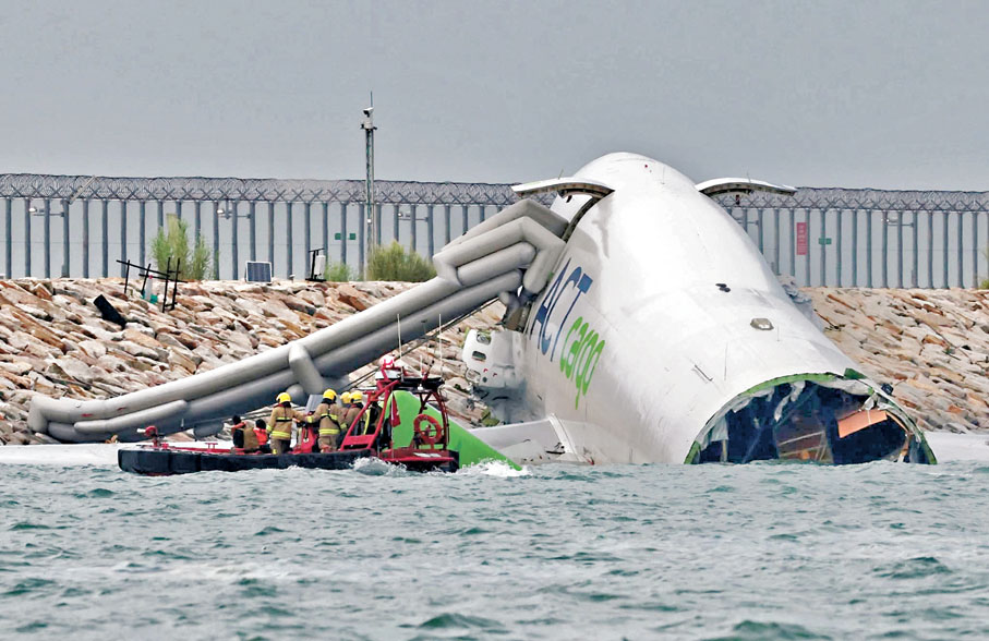 一架由阿聯酋飛抵香港、航班編號UAE9788的波音747-400貨機,周一(20日)凌晨在香港國際機場北跑道降落滑行期間,突然急轉向偏離跑道撞向巡邏車一同墜海,釀成車上兩人死亡。斷為兩截的貨機昨日(22日)仍留在跑道旁海中有待打撈,有工程人員續在現場打撈機尾的黑盒。土耳其民航當局及負責民用運輸事故調查的美國國家運輸安全委員會(NTSB)將派出專家來港協助調查事故。特區政府表示,涉事機組人員在意外後一直留港協助調查,而土耳其方面已承諾會全力支持及配合相關調查工作,包括安排航空公司代表與家屬會面。 ●香港文匯報記者 蕭景源