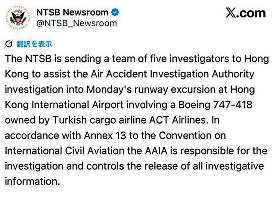 NTSB於當地時間10月21日在社交平台發文指,將派出由5名調查員組成的團隊到香港,協助香港運輸及物流局轄下的民航意外調查機構(AAIA)調查今次飛機事故。NTSB在文中指,根據《國際民用航空公約》,AAIA將負責調查工作,並掌管相關調查資料的公布。