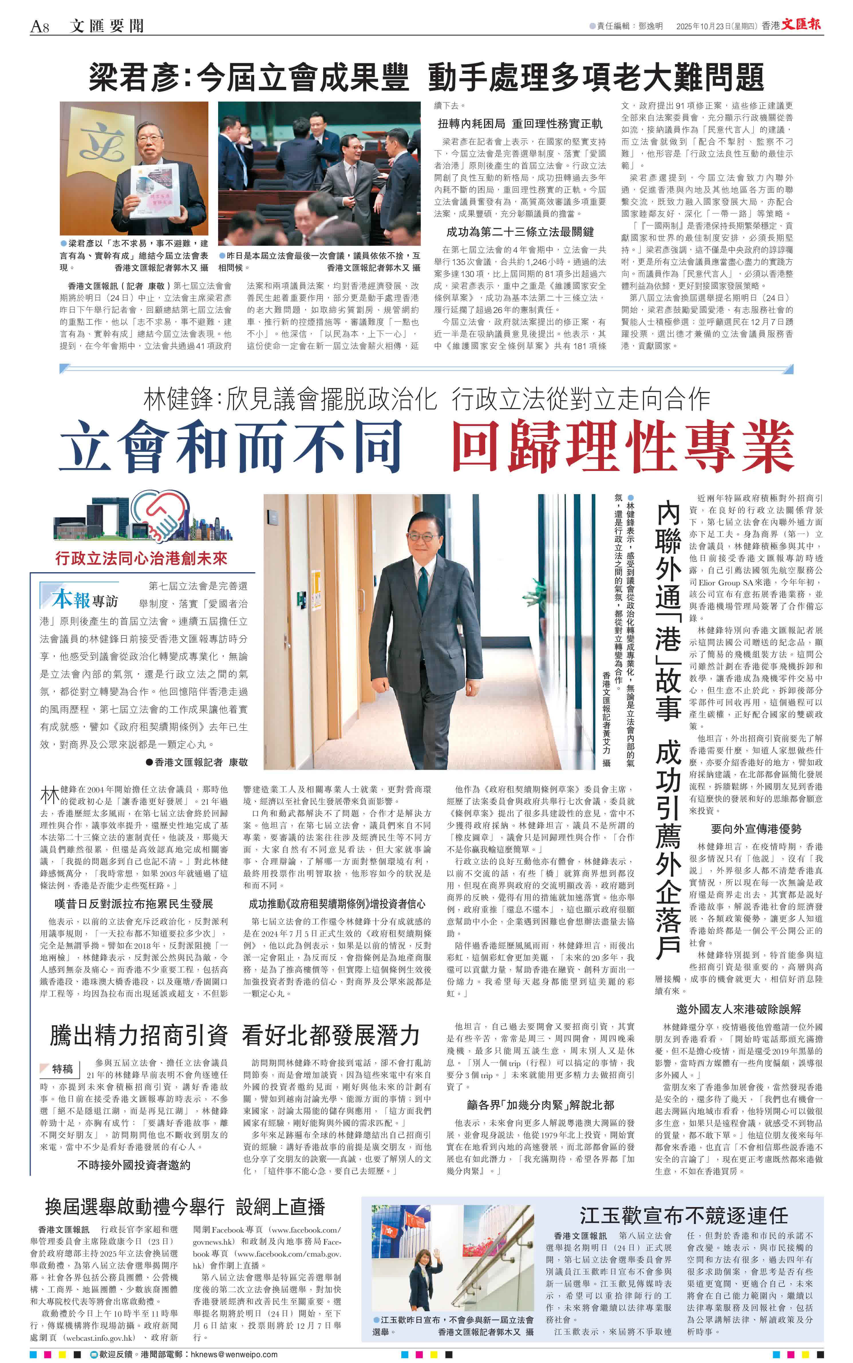 (香港文匯報記者康敬)第七屆立法會是完善選舉制度、落實「愛國者治港」原則後產生的首屆立法會。連續五屆擔任立法會議員的林健鋒日前接受香港文匯報專訪時分享,他感受到議會從政治化轉變成專業化,無論是立法會內部的氣氛,還是行政立法之間的氣氛,都從對立轉變為合作。他回憶陪伴香港走過的風雨歷程,第七屆立法會的工作成果讓他着實有成就感,譬如《政府租契續期條例》去年已生效,對商界及公眾來說都是一顆定心丸。