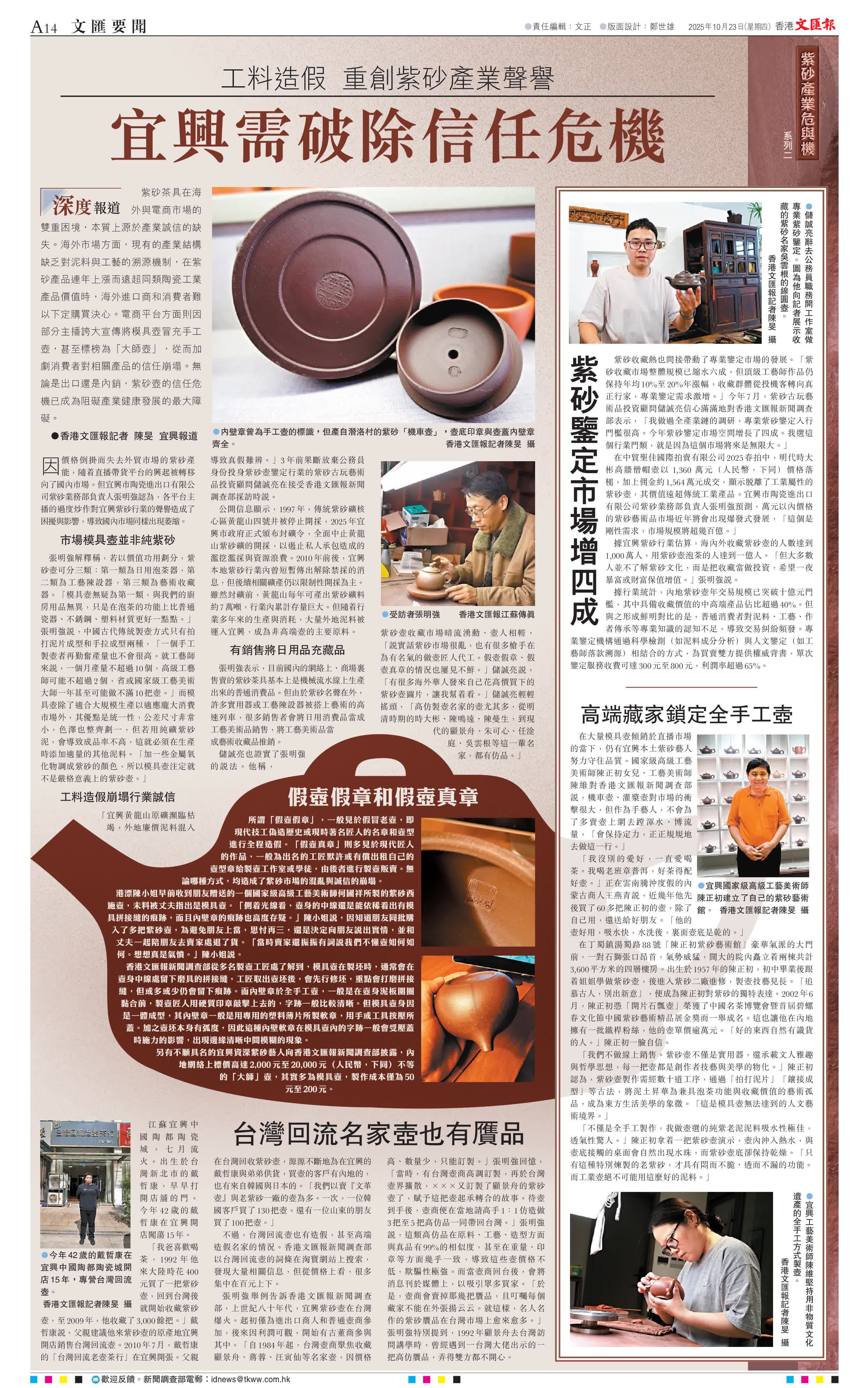 紫砂收藏熱也間接帶動了專業鑒定市場的發展。「紫砂收藏市場整體規模已縮水六成,但頂級工藝師作品仍保持年均10%至20%年漲幅,收藏群體從投機客轉向真正行家,專業鑒定需求激增。」今年7月,紫砂古玩藝術品投資顧問儲誠亮信心滿滿地對香港文匯報新聞調查部表示,「我做過全產業鏈的調研,專業紫砂鑒定入行門檻很高。今年紫砂鑒定市場空間增長了四成。我選這個行業門類,就是因為這個市場將來是無限大。」