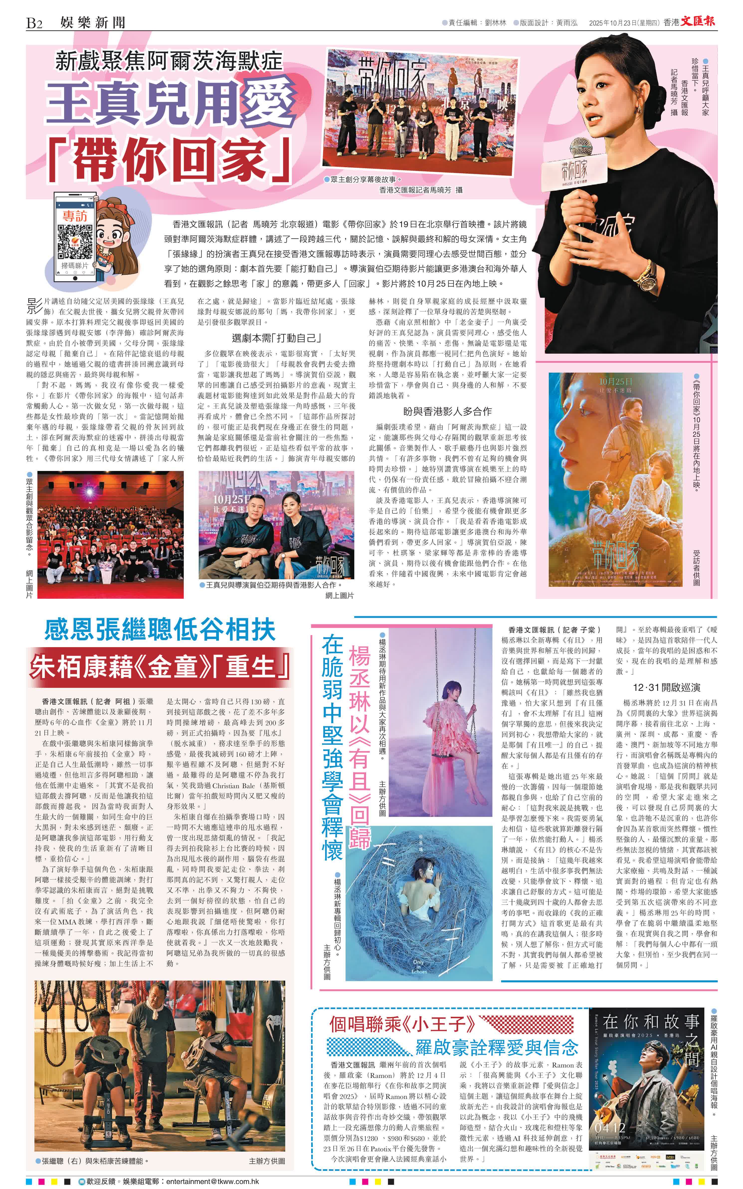 (香港文匯報記者馬曉芳 北京報道)電影《帶你回家》於19日在北京舉行首映禮。該片將鏡頭對準阿爾茨海默症群體,講述了一段跨越三代,關於記憶、誤解與最終和解的母女深情。女主角「張緣緣」的扮演者王真兒在接受香港文匯報專訪時表示,演員需要同理心去感受世間百態,並分享了她的選角原則:劇本首先要「能打動自己」。導演賀伯亞期待影片能讓更多港澳台和海外華人看到,在觀影之餘思考「家」的意義,帶更多人「回家」。影片將於10月25日在內地上映。影片講述自幼隨父定居美國的張緣緣(王真兒 飾)在父親去世後,攜女兒將父親骨灰帶回國安葬。原本打算料理完父親後事即返回美國的張緣緣卻遇到母親安娜(李萍飾)確診阿爾茨海默症。由於自小被帶到美國,父母分開,張緣緣認定母親「拋棄自己」。在陪伴記憶衰退的母親的過程中,她通過父親的遺書拼湊回溯意識到母親的隱忍與痛苦,最終與母親和解。