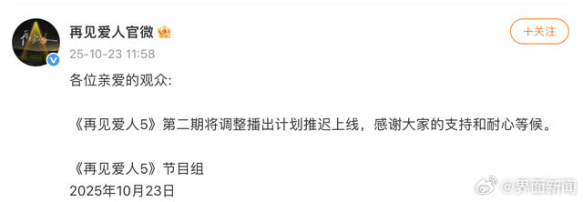 《再見愛人5》節目組10月23日發文稱,第二期將調整播出計劃推遲上線。