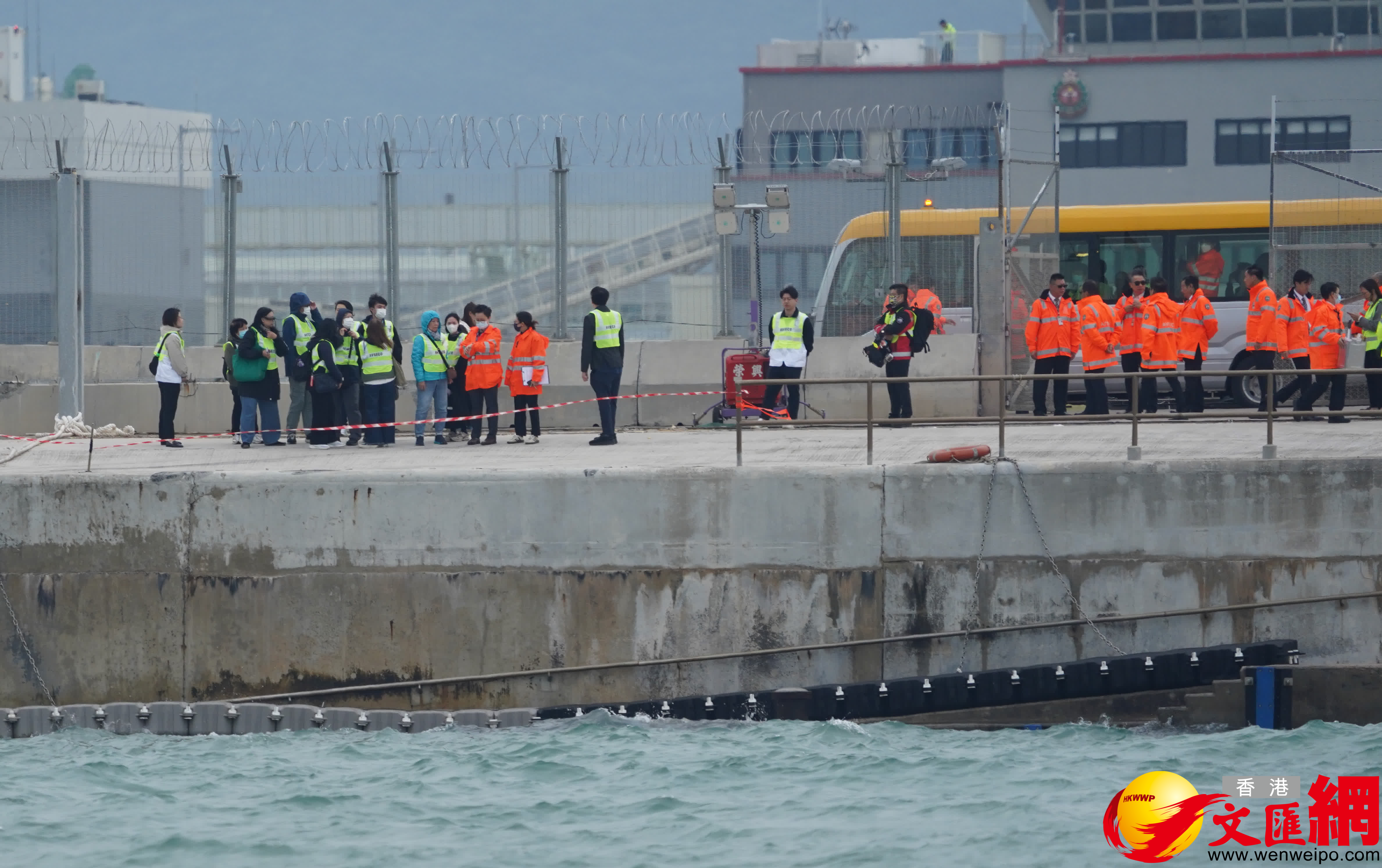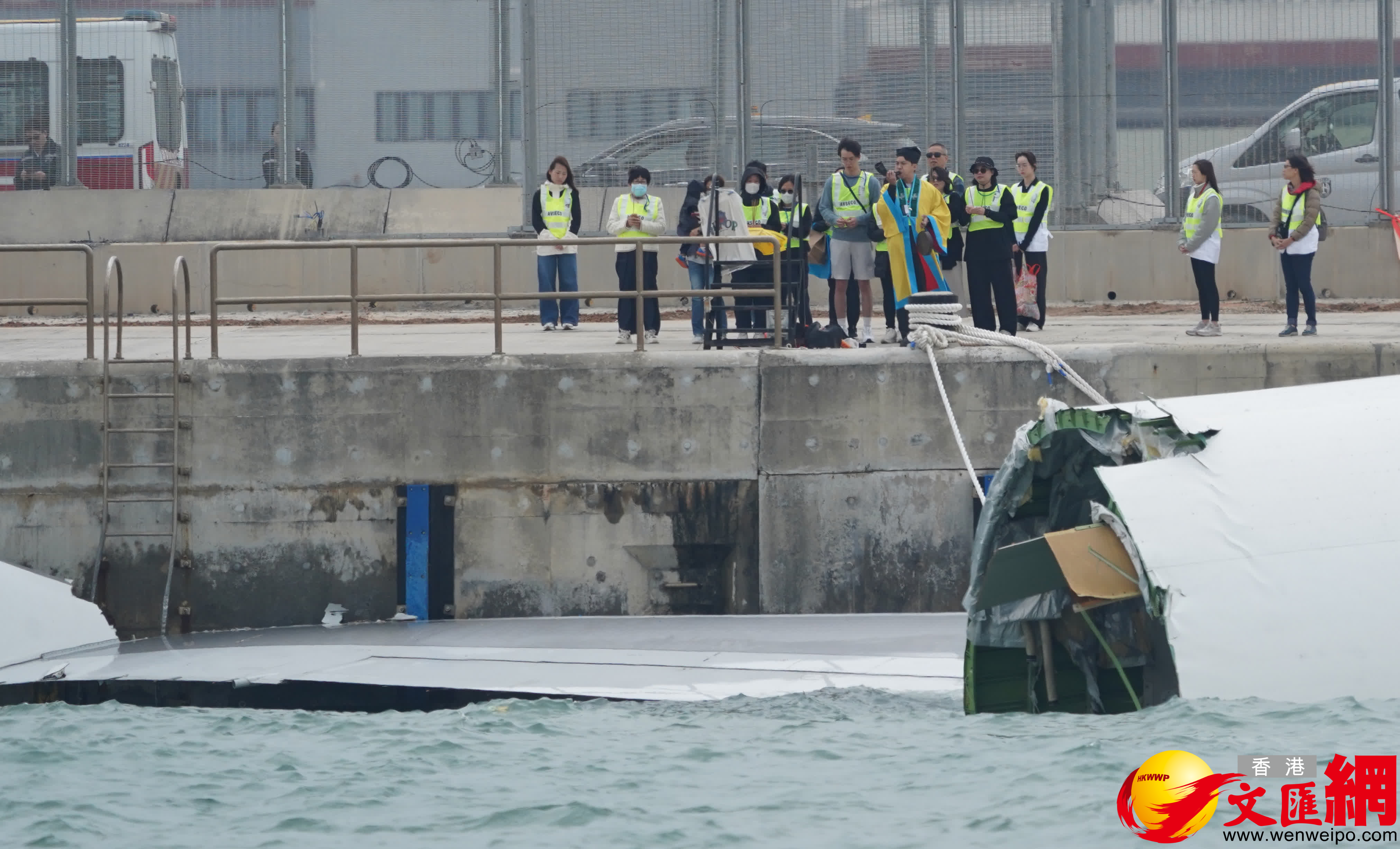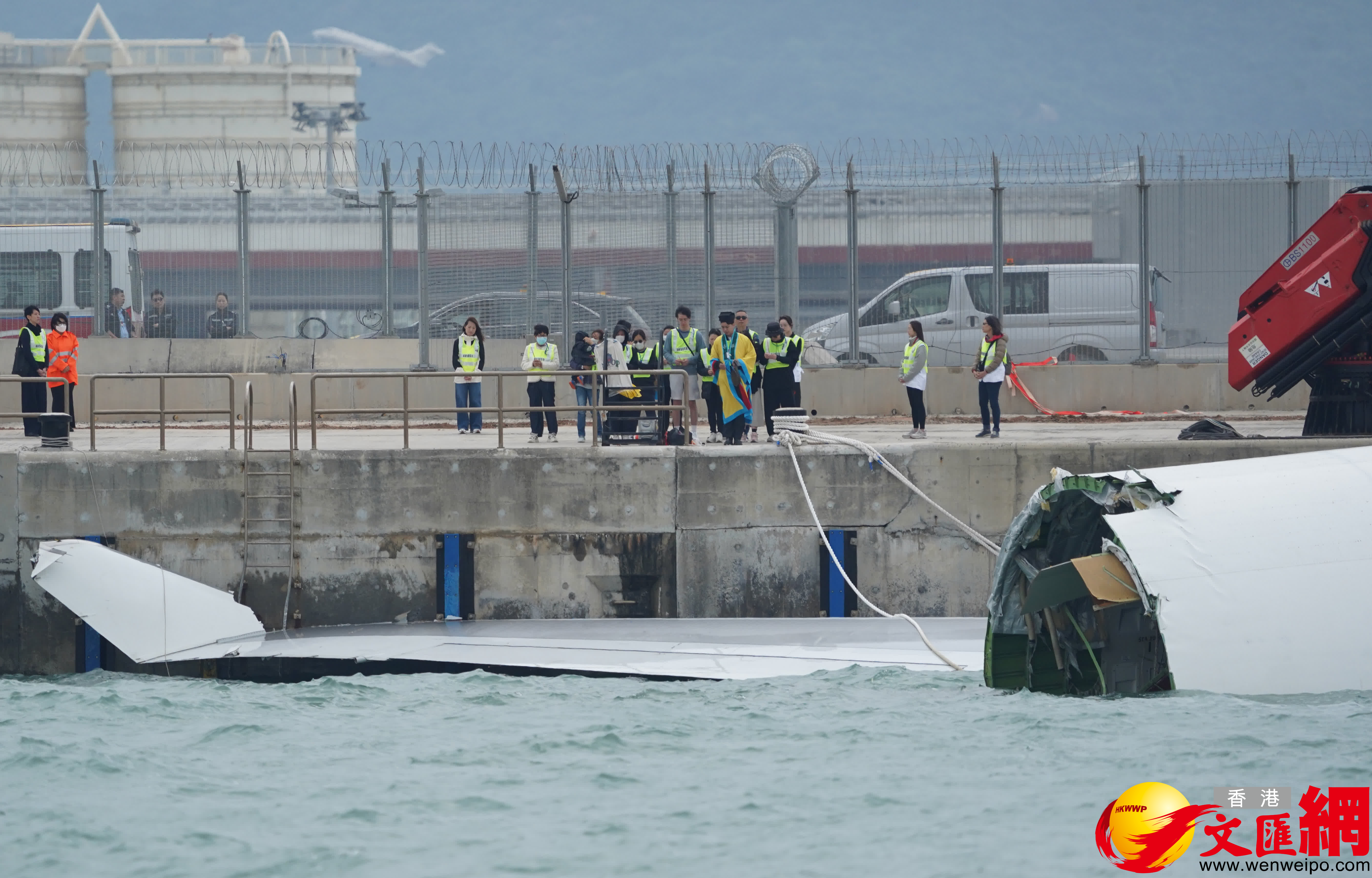 香港文匯報訊(記者 蕭景源)一架由阿聯酋飛抵香港、航班編號UAE9788的波音747-400貨機,本周一(20日)凌晨在香港國際機場北跑道降落滑行期間,突然急轉向偏離跑道撞向巡邏車一起墮海,釀成巡邏車上兩名AVSECO機場保安人員死亡。今日(23日)上午10時40分,兩名死者家屬共約10多人身穿反光衣,與道士乘搭由當局安排的小巴,一行抵達機場北跑道對開進行路祭。