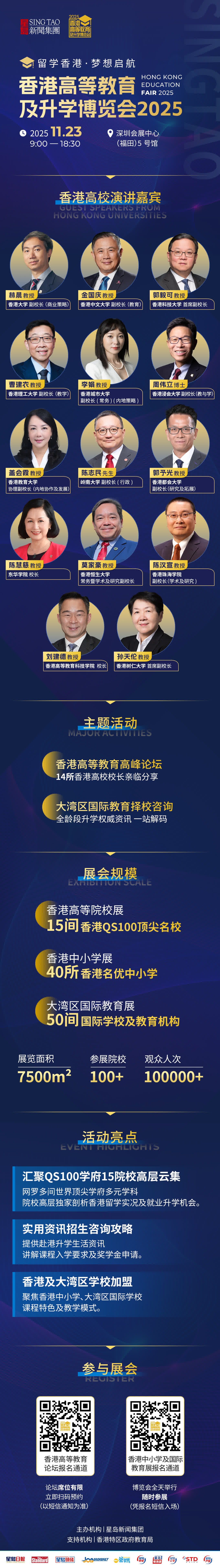 據悉,展會由星島新聞集團舉辦,預計有40所香港中小學,50間國際學校及教育機構,以及15所香港高校參與。其中,15所高校校長、副校長將親臨現場,傾力打造「香港高等教育高峰論壇」,不僅涵蓋「港八大」等頂尖學府,更有5所高校位列QS全球百強。活動現場,校長們將面對面為大家深度解讀香港留學實況及升學就業機會,分享赴港升學生活等相關資訊。