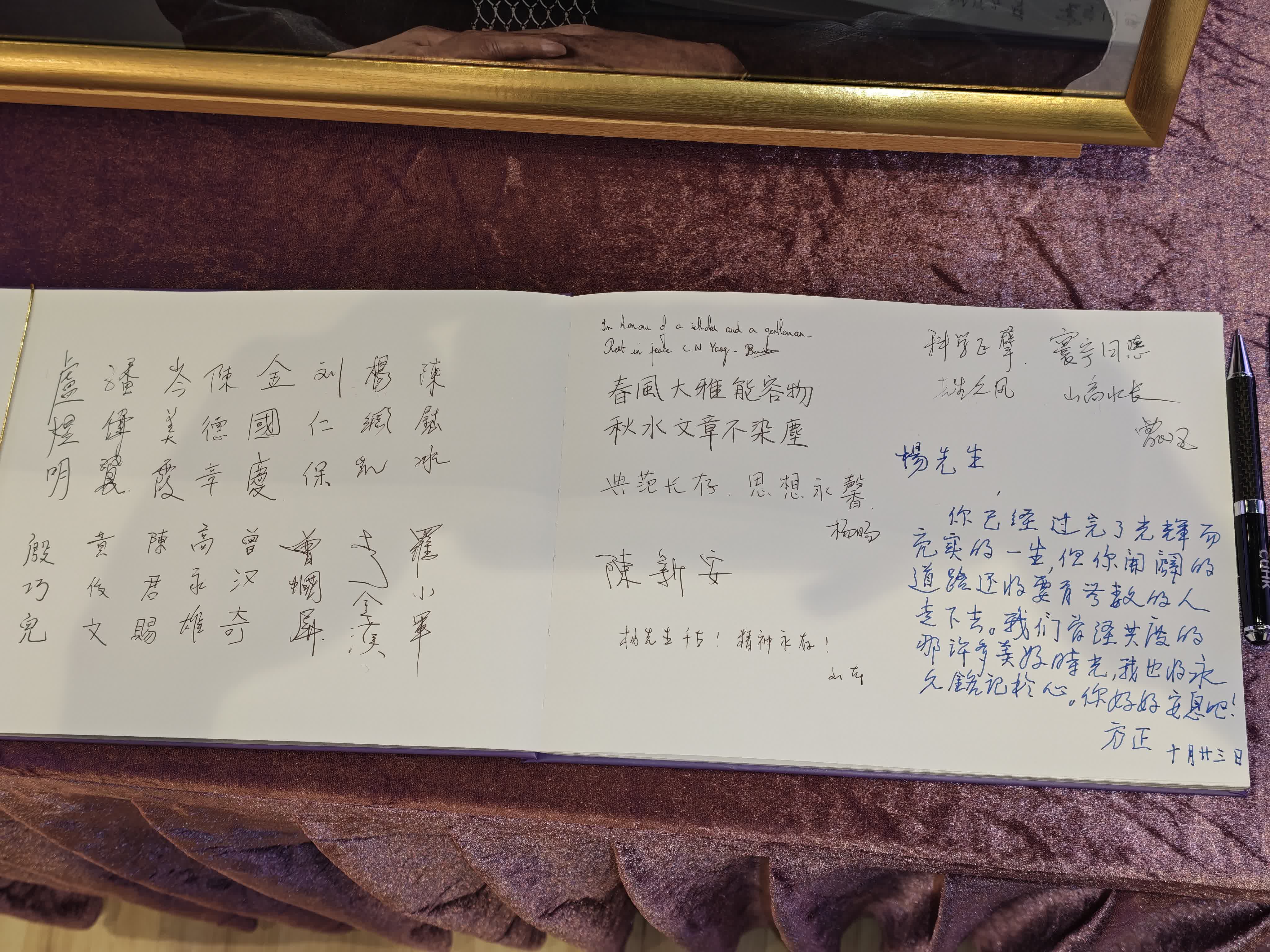 曾在中大物理系執教超30年、現已85歲的榮譽院士陳方正回憶,他和楊振寧已是相識近40年的老朋友,指楊振寧的研究在基本物理學理論的進步上起到了決定性的作用。他引用孟子的「充實而有光輝之謂大」形容楊振寧教授的一生,讚他是「一個真正的偉人」。在遺照前,他留言寫道,「楊先生,你已經過完了光輝而充實的一生,但你開闢的道路還要有無數的人走下去。我們曾經共度的那許多美好時光,我也將永久銘記於心,你好好安息吧。」