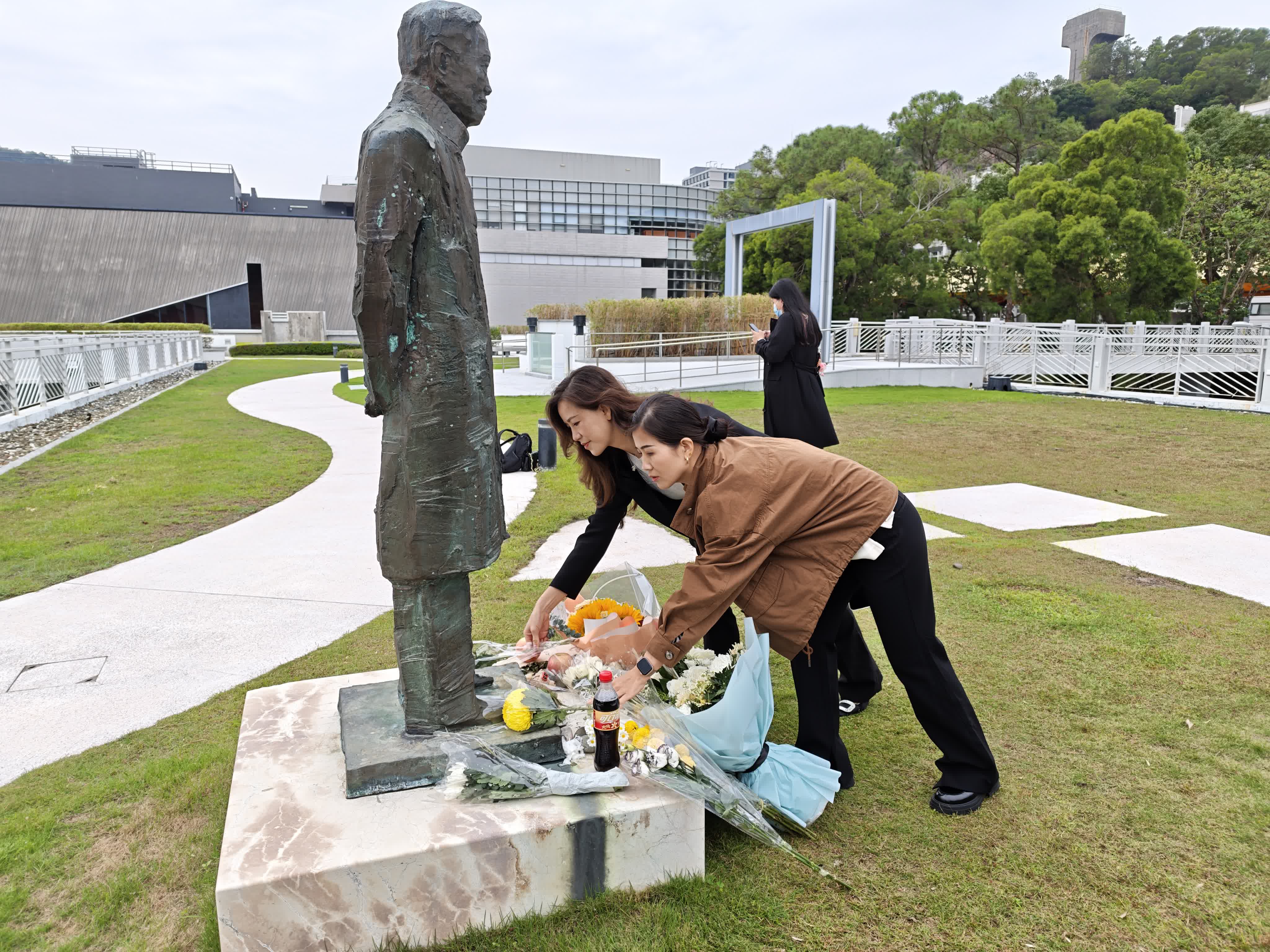 在弔唁室不遠處的邵逸夫夫人樓天台花園草坪上,屹立着中大於2007年為楊振寧榮獲諾貝爾獎50周年暨85歲生日而揭幕的銅像,雕像腳下簇擁着鮮花。浙江工業大學的曹飛鳳老師今年以訪問學者身份來到香港中文大學學習。她和她的朋友在得知弔唁室開放後,便從家邊街市購買鮮花,特地帶到雕像前獻上。她指自己也有國外留學經驗,對楊振寧教授在當時國內條件並不算優渥的情況下,毅然決然回國的精神感到感動,表示這是每一個在國外研究的學子的心愿,值得所有人學習。