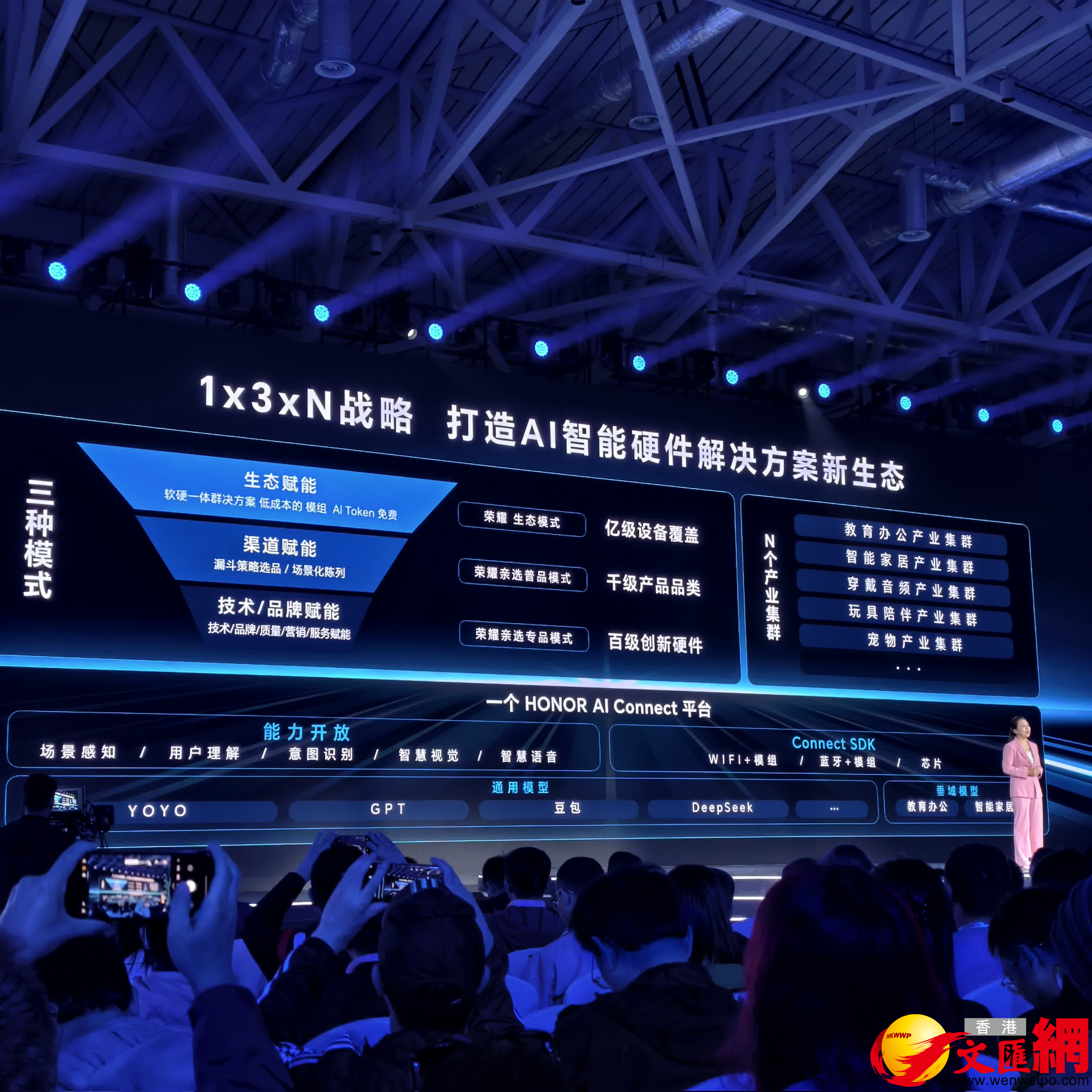 面對AI終端生態碎片化的挑戰,在AI時代構建以人為中心,硬件和軟件融合的場景化生態。榮耀發布「1×3×N」生態戰略,打造跨品牌、跨場景、跨設備的智能互聯生態。其中,「1」代表HONOR AI Connet平台,可將榮耀的AI能力開放給所有的生態合作夥伴;「3」代表通過「生態賦能」、「渠道賦能」以及「技術與品牌賦能」三種模式扶持合作夥伴;N代表榮耀將覆蓋教育辦公、智能家居、音頻穿戴、玩具陪伴、寵物等N個產業集群。