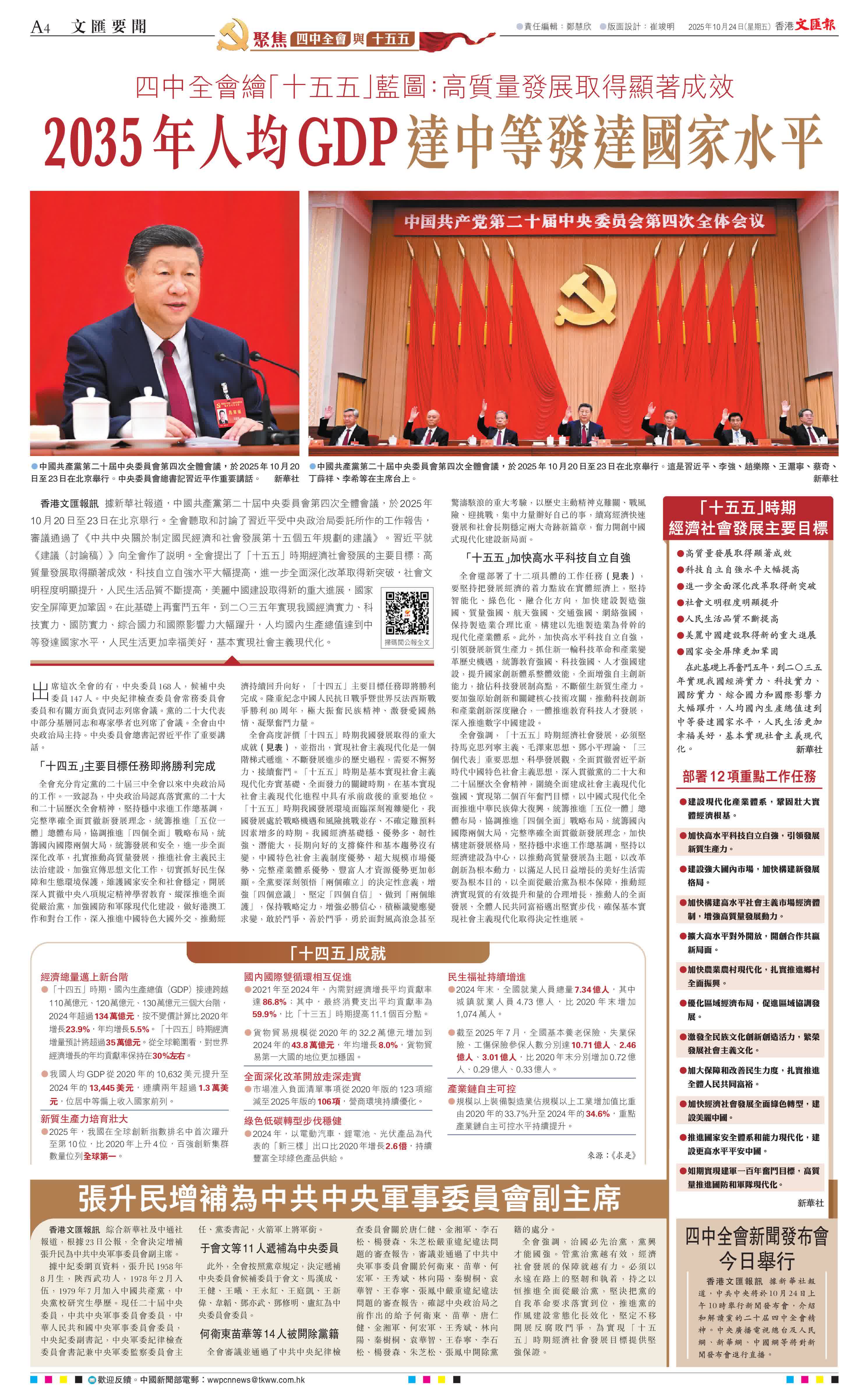 香港文匯報訊 據新華社報道,中國共產黨第二十屆中央委員會第四次全體會議,於2025年10月20日至23日在北京舉行。全會聽取和討論了習近平受中央政治局委託所作的工作報告,審議通過了《中共中央關於制定國民經濟和社會發展第十五個五年規劃的建議》。習近平就《建議(討論稿)》向全會作了說明。全會提出了「十五五」時期經濟社會發展的主要目標:高質量發展取得顯著成效,科技自立自強水平大幅提高,進一步全面深化改革取得新突破,社會文明程度明顯提升,人民生活品質不斷提高,美麗中國建設取得新的重大進展,國家安全屏障更加鞏固。在此基礎上再奮鬥五年,到二〇三五年實現我國經濟實力、科技實力、國防實力、綜合國力和國際影響力大幅躍升,人均國內生產總值達到中等發達國家水平,人民生活更加幸福美好,基本實現社會主義現代化。