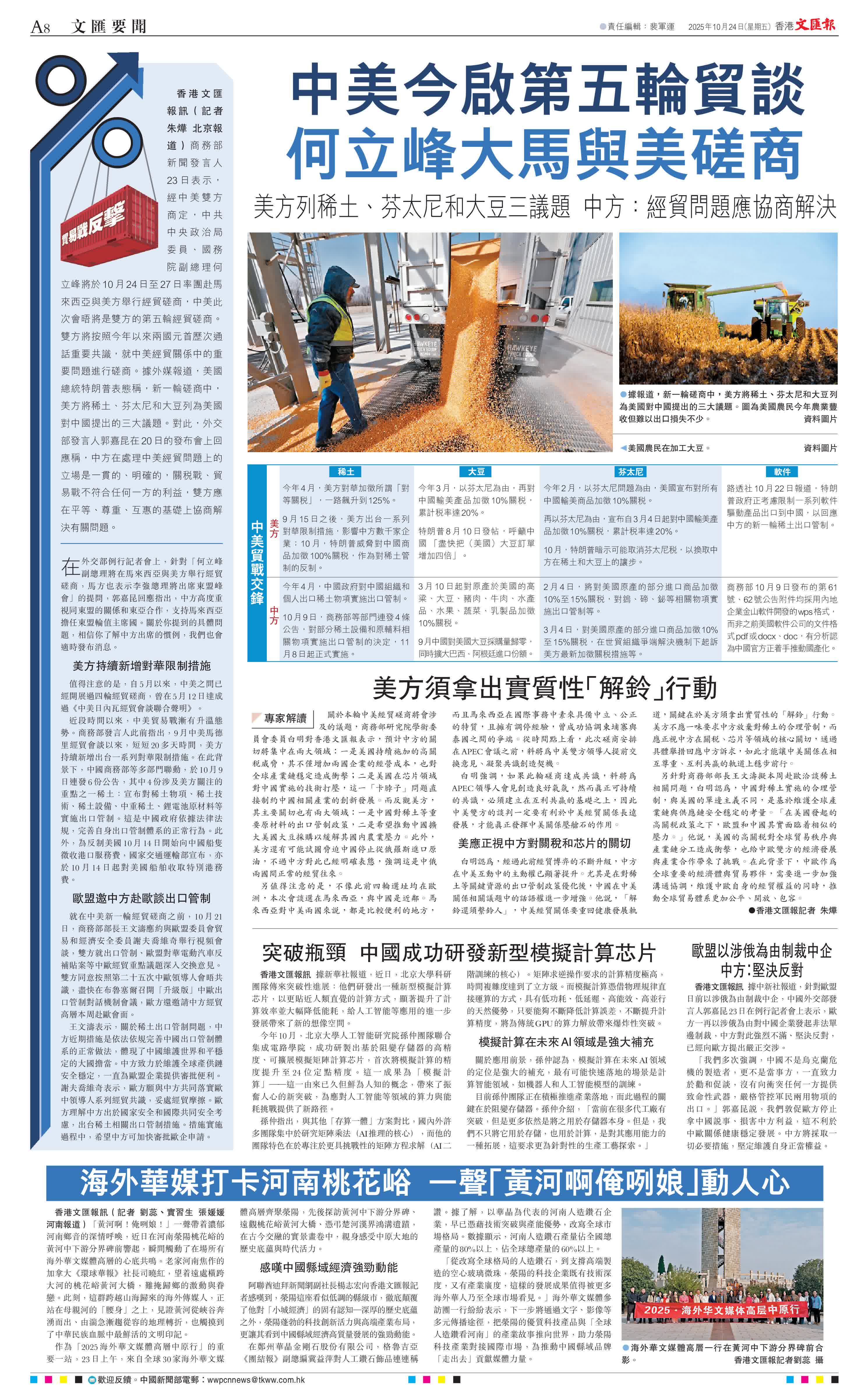 (香港文匯報記者朱燁 北京報道)商務部新聞發言人23日表示,經中美雙方商定,中共中央政治局委員、國務院副總理何立峰將於10月24日至27日率團赴馬來西亞與美方舉行經貿磋商,中美此次會晤將是雙方的第五輪經貿磋商。雙方將按照今年以來兩國元首歷次通話重要共識,就中美經貿關係中的重要問題進行磋商。據外媒報道,美國總統特朗普表態稱,新一輪磋商中,美方將稀土、芬太尼和大豆列為美國對中國提出的三大議題。對此,外交部發言人郭嘉昆在20日的發布會上回應稱,中方在處理中美經貿問題上的立場是一貫的、明確的,關稅戰、貿易戰不符合任何一方的利益,雙方應在平等、尊重、互惠的基礎上協商解決有關問題。
