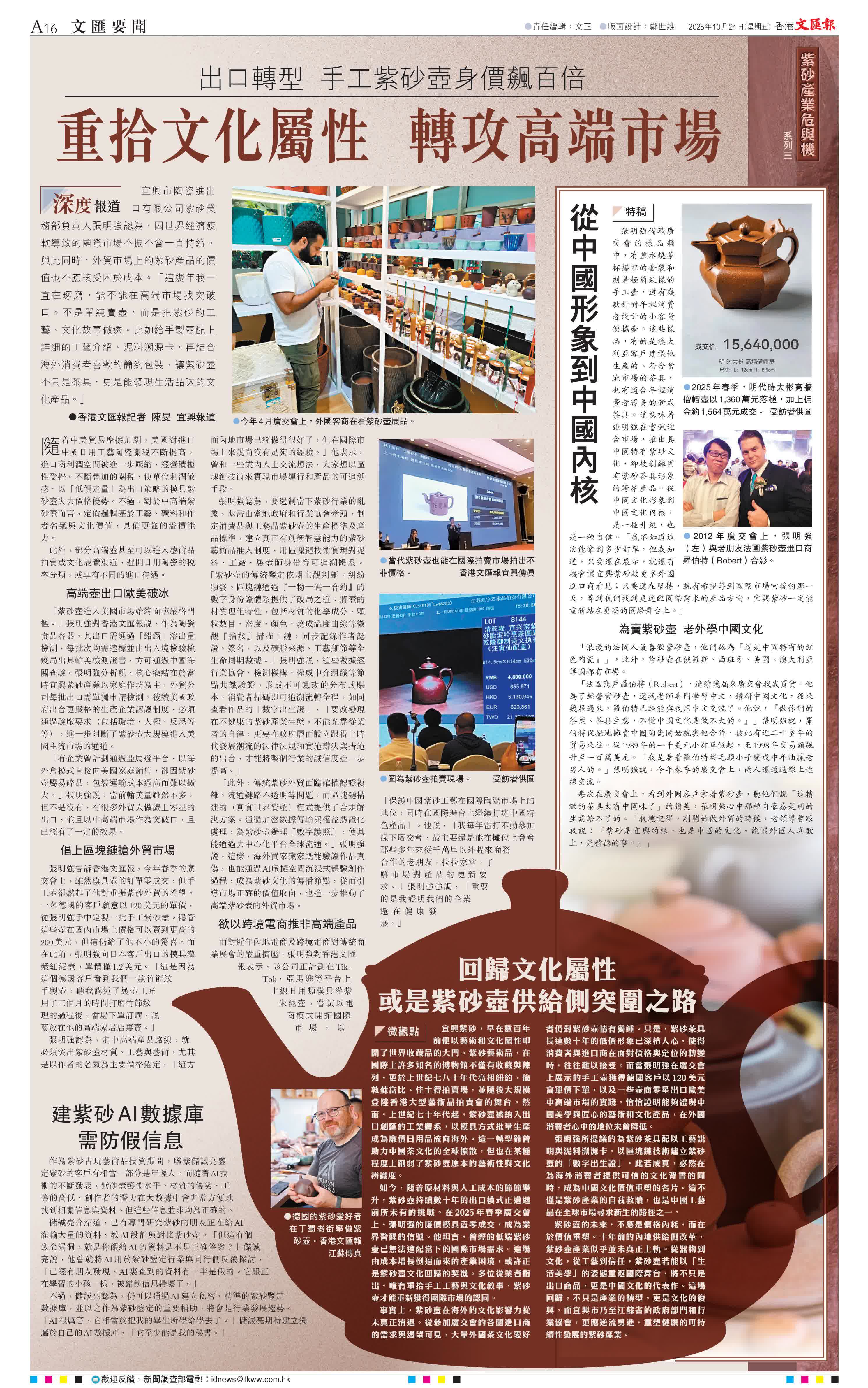 「此外,傳統紫砂外貿面臨確權認證複雜、流通鏈路不透明等問題,而區塊鏈構建的(真實世界資產)模式提供了合規解決方案。通過加密數據傳輸與權益憑證化處理,為紫砂壺辦理『數字護照』,使其能通過去中心化平台全球流通。」張明強說,這樣,海外買家藏家既能驗證作品真偽,也能通過Al虛擬空間沉浸式體驗創作過程,成為紫砂文化的傳播節點,從而引導市場正確的價值取向,也進一步推動了高端紫砂壺的外貿市場。