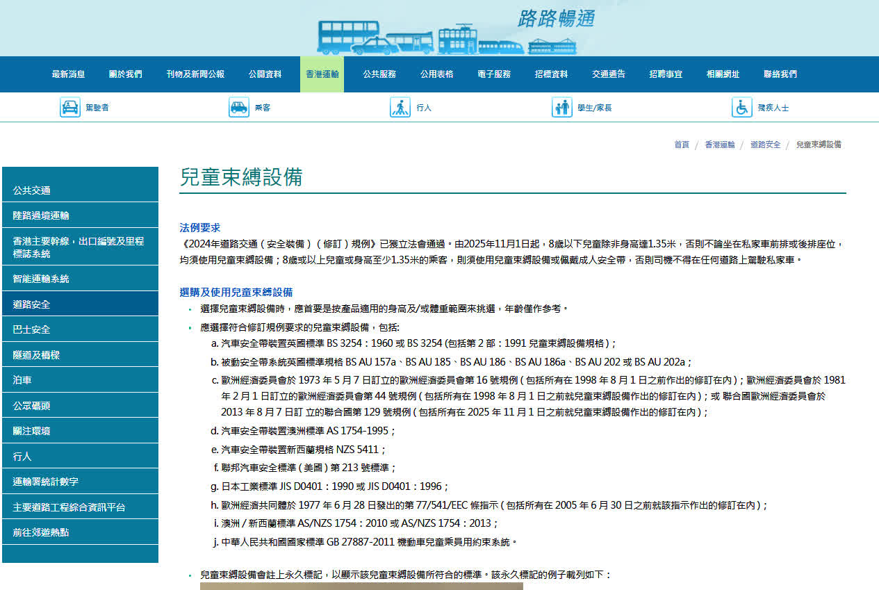 市民可參閱運輸署兒童束縛設備專頁、Agent T Facebook專頁懶人包,以及消費者委員會《選擇》月刊相關文章,了解法例要求和選購要點,或致電署方熱線2804 2600查詢。
