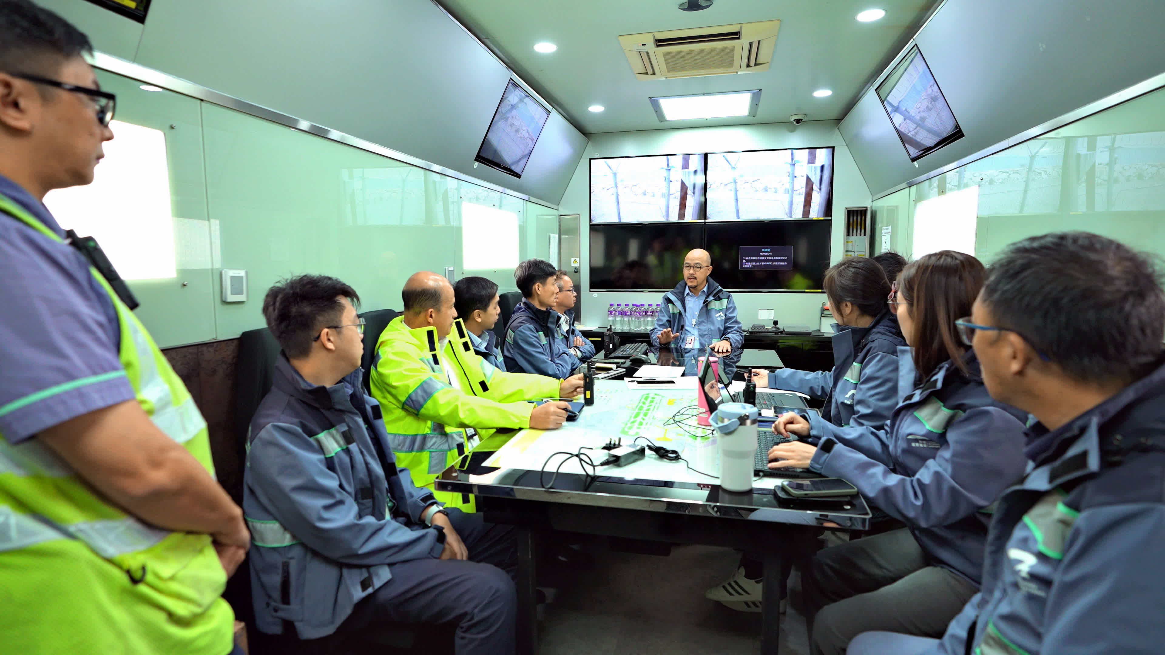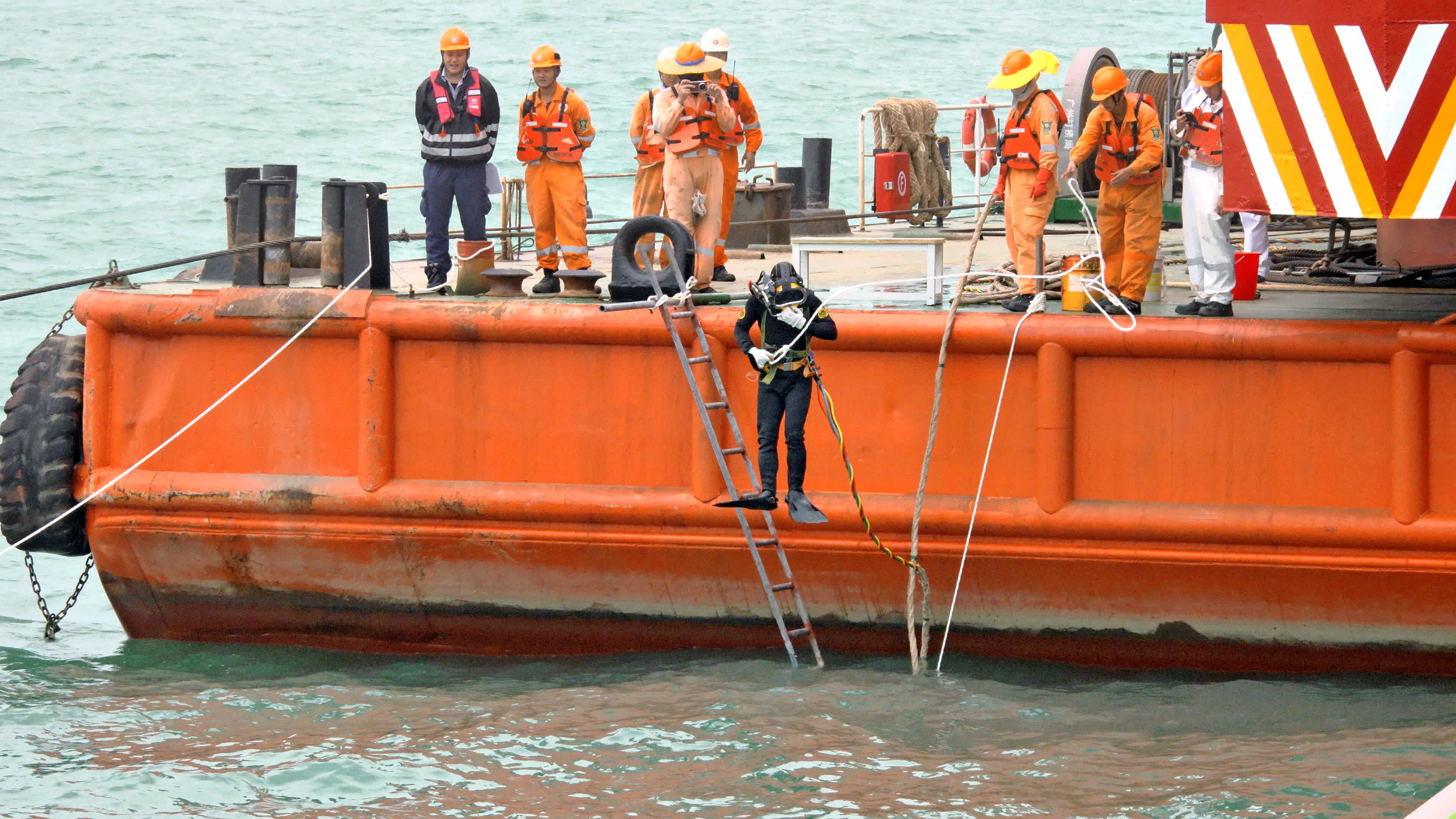 繼專業團隊日前利用聲納裝置在海床進行掃瞄及測量,昨日(23日)廣州打撈局的打撈船「南天翔」、「南天鵬」及拖船「穗救拖18」抵港作準備工作,今日(24日)早上9時許,三艘打撈船及拖船駛近貨機殘骸準備打撈,其間岸上有多名穿反光衣人員在場視察及戒備。