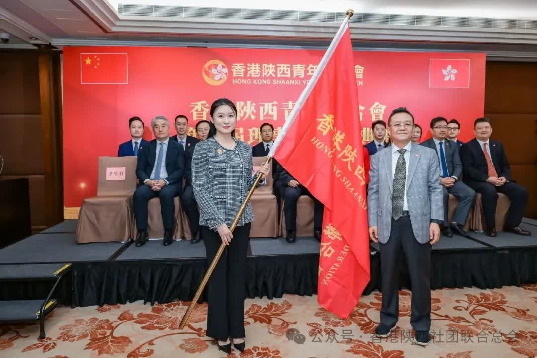 在全體嘉賓的見證下,香港陝西社團聯合總會主席景哈利先生向香港陝西青年聯合會首任會長王夢詩女士授予會旗。旗幟飄揚,象徵著責任的傳遞與使命的承接。