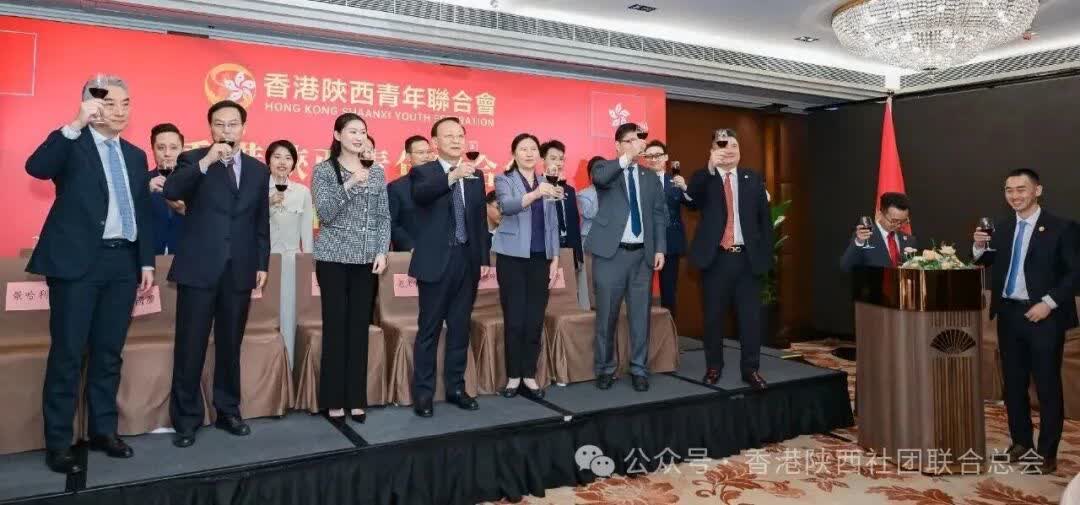 在歡快的音樂聲中,主禮嘉賓共同舉杯祝酒,祝願香港陝西青年聯合會前程似錦、再創輝煌。現場氣氛達到高潮,成立大會在熱烈掌聲中圓滿禮成。
