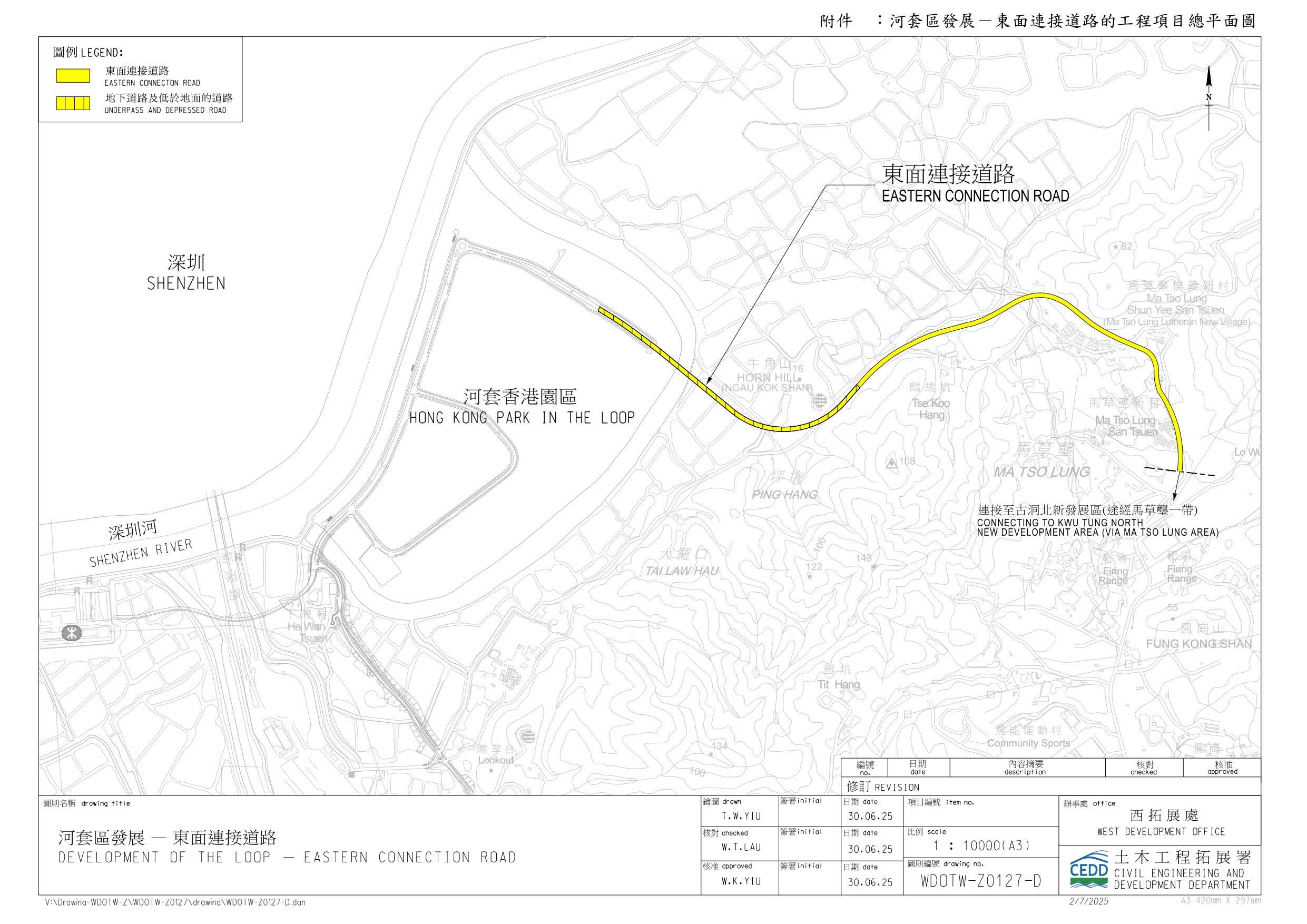 根據土木工程拓展署今年7月向元朗區議會簡介「河套區發展 ─東面連接道路」文件提到,為進一步加強河套香港園區對外的交通聯繫,土拓署現正規劃及設計一條東面連接道路,連接香港園區與古洞北新發展區的新建道路網絡,目標於2031年或之前完成有關道路工程。土拓署已於2023年12月就項目展開勘查研究:並就有關工程項目進行設計和相關技術影響評估、法定程序預備工作、以及公眾諮詢等。