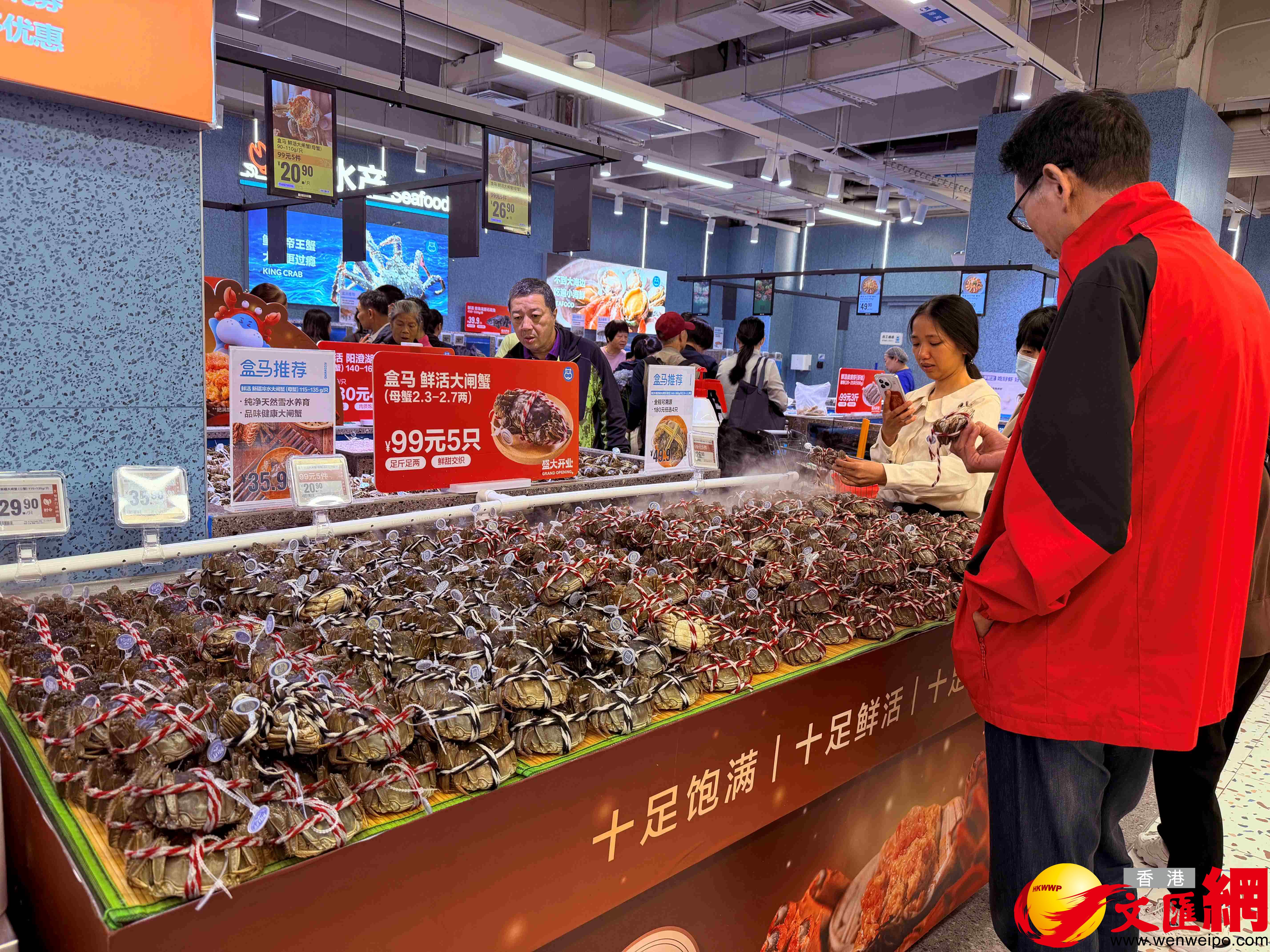盒馬水產採購霖旭介紹,近一周以來深圳大閘蟹銷售呈現爆發式增長,此次梅林店距離皇崗關口5公里,為了更好的滿足周邊居民以及來訪港客的需求,盒馬也加大了大閘蟹、波龍、澳龍和三文魚等商品的備貨量。