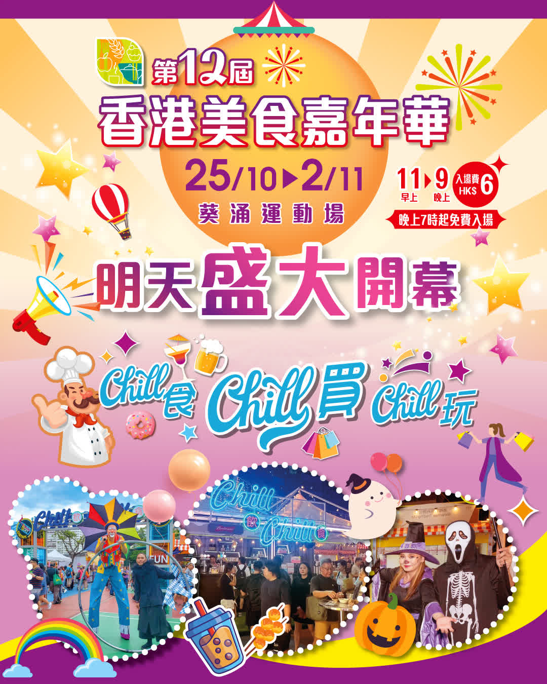 美食嘉年華亦將在「為食Guide」和「Chill飲Chill食區」兩大餐飲專區,設超過70個熟食和美酒攤位,匯聚過百款來自本地及海内外的美食、各式酒品以及佐酒小食,酒吧更有調酒師即場調製多款期間限定雞尾酒。