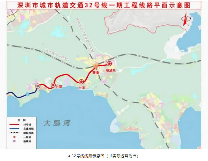 地鐵32號線一期位於大鵬新區,起自8號線三期溪涌站,共設上洞、土洋、葵涌、葵涌東4座車站,線路全長約9.53公里。其中,32號線葵涌站與深惠城際大鵬支線葵涌站將形成T型換乘。