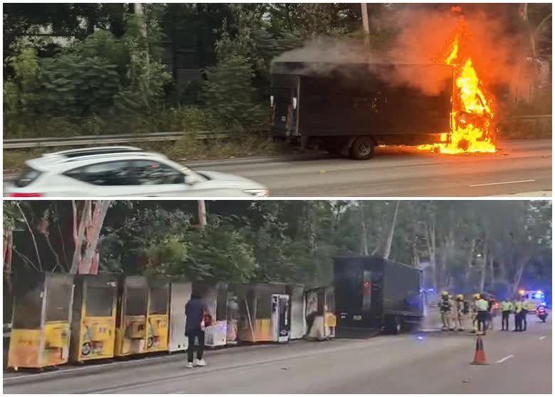 有網上片段顯示,事發時火勢猛烈且迅速蔓延,輕型貨車車頭瞬間陷入火海。火勢撲熄後,貨斗內包括多部夾公仔機被搬出路面,可見夾公仔機俱嚴重熏黑。