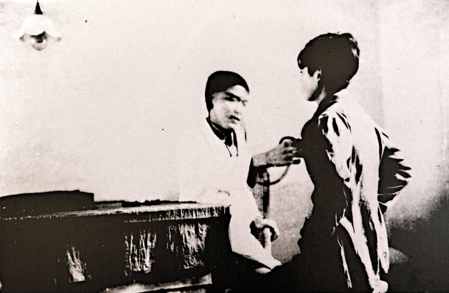 在劉勝欣的印象裏,父親每月只能回一趟家,每次回來都是一臉疲態,連清點藥品的算盤都撥不動,需要子女幫忙才行。「記得有一回我問父親,山裏走夜路的時候害不害怕,父親便大聲唱起了『大刀向鬼子們的頭上砍去』,然後笑着告訴我,唱着歌心裏就有勁兒了,什麼牛鬼蛇神都被一刀刀砍跑啦。」
