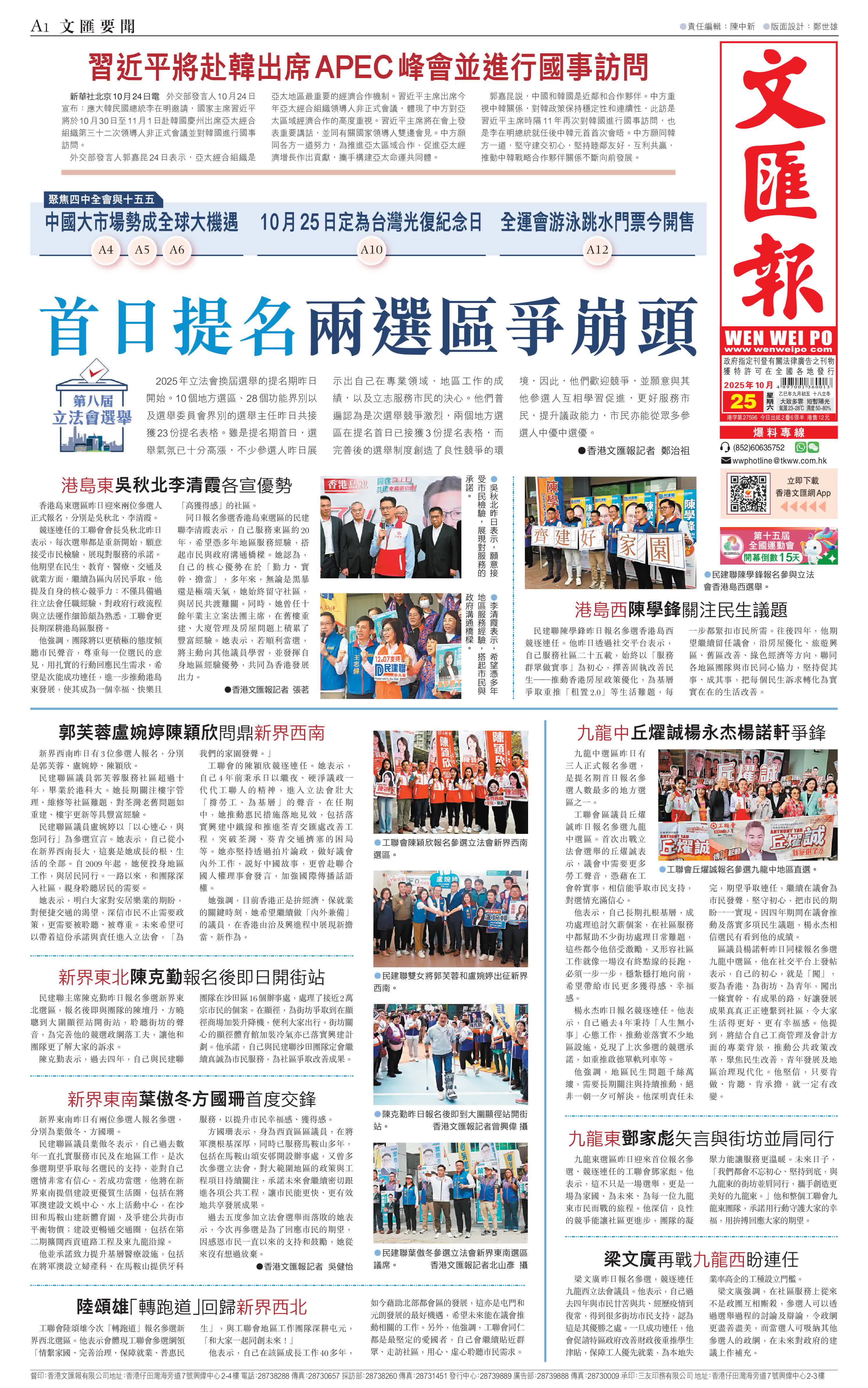 (香港文匯報記者 鄭治祖、吳健怡、張茗)2025年立法會換屆選舉的提名期昨日開始。10個地方選區、28個功能界別以及選舉委員會界別的選舉主任昨日共接獲23份提名表格。雖是提名期首日,選舉氣氛已十分高漲,不少參選人昨日展示出自己在專業領域、地區工作的成績,以及立志服務市民的決心。他們普遍認為是次選舉競爭激烈,兩個地方選區在提名首日已接獲3份提名表格,而完善後的選舉制度創造了良性競爭的環境,因此,他們歡迎競爭,並願意與其他參選人互相學習促進,更好服務市民,提升議政能力,市民亦能從眾多參選人中優中選優。