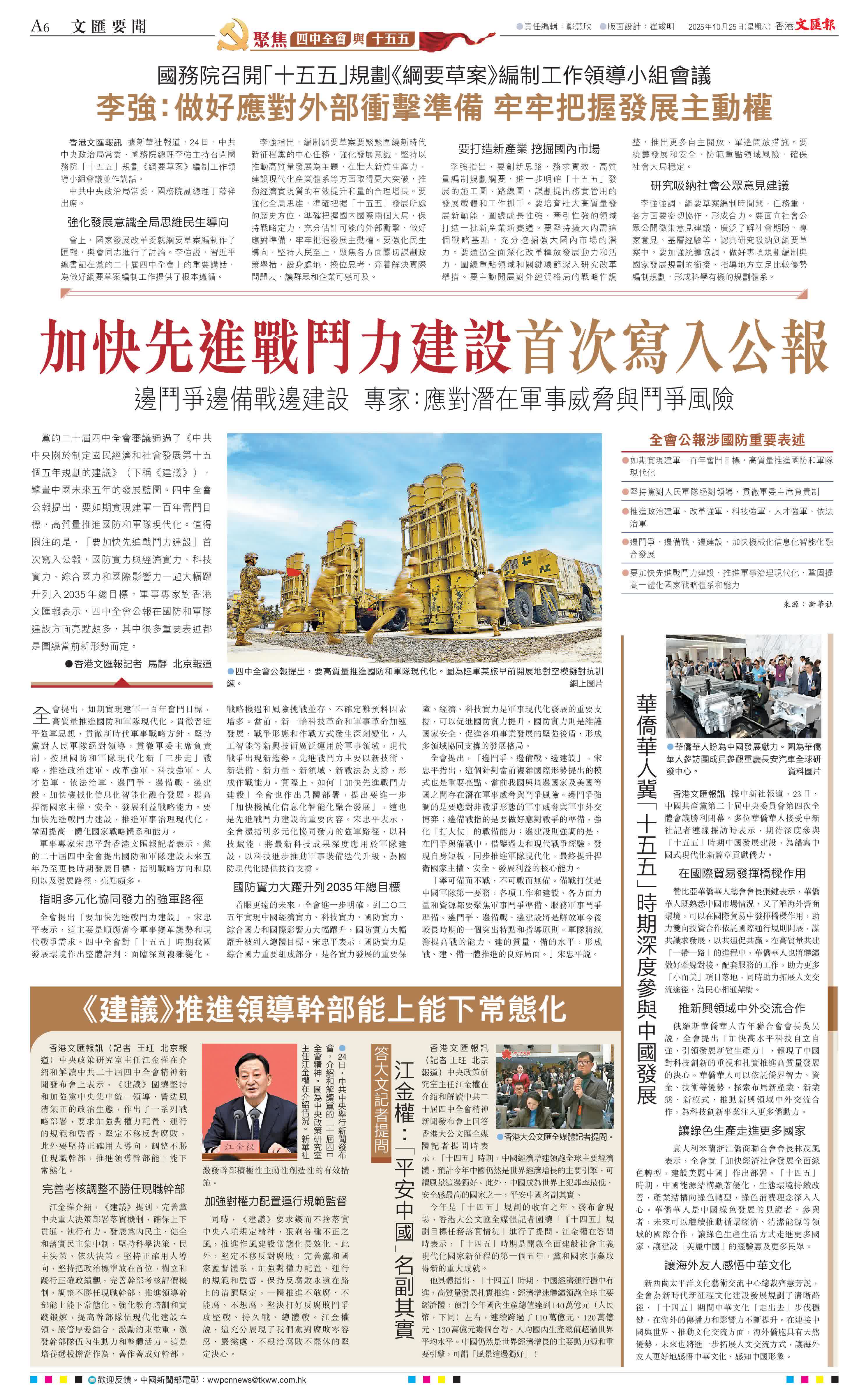 (香港文匯報記者 馬靜 北京報道)黨的二十屆四中全會審議通過了《中共中央關於制定國民經濟和社會發展第十五個五年規劃的建議》(下稱《建議》),擘畫中國未來五年的發展藍圖。四中全會公報提出,要如期實現建軍一百年奮鬥目標,高質量推進國防和軍隊現代化。值得關注的是,「要加快先進戰鬥力建設」首次寫入公報,國防實力與經濟實力、科技實力、綜合國力和國際影響力一起大幅躍升列入2035年總目標。軍事專家對香港文匯報表示,四中全會公報在國防和軍隊建設方面亮點頗多,其中很多重要表述都是圍繞當前新形勢而定。
